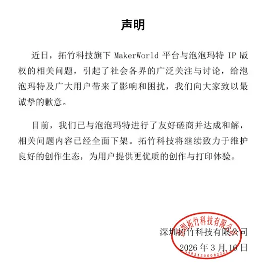 2026年3月16日,一份简短却分量十足的致歉声明,让消费级3D打印行业瞬间聚焦。估值高达400亿元的3D打印独角兽——拓竹科技,就旗下MakerWorld平台涉嫌侵犯泡泡玛特IP版权一事公开道歉,宣布双方已友好和解,平台内所有侵权内容全面下架。