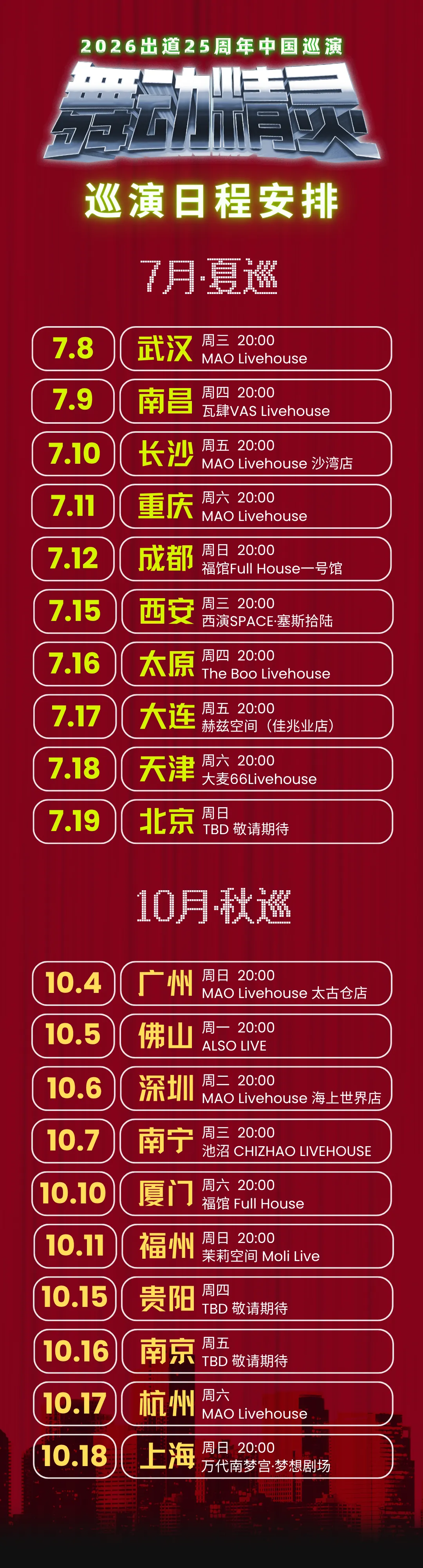 此次巡演,乐团将对经典曲目进行完整演绎,还将根据粉丝的热切呼声,为每一站特别定制歌单,并呈现此前未曾演唱的全新限定歌曲,带来独一无二的现场体验。同时,视觉效果也将全面升级,配合充满情感张力的千禧年复古设计,打造热烈而富有怀旧感的氛围,让每一位观众都能在音乐与视觉的双重冲击中,重新找回属于自己的青春记忆。期待各地的观众朋友们亲临现场,一同解锁更多惊喜!