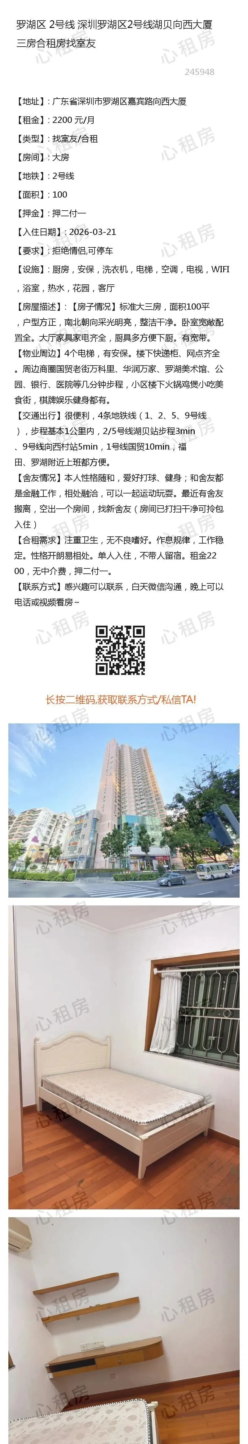 深圳租房【罗湖4则】房源①:2号线深圳罗湖湖贝向西大厦三房合租房找室友2200元/月;房源②:…