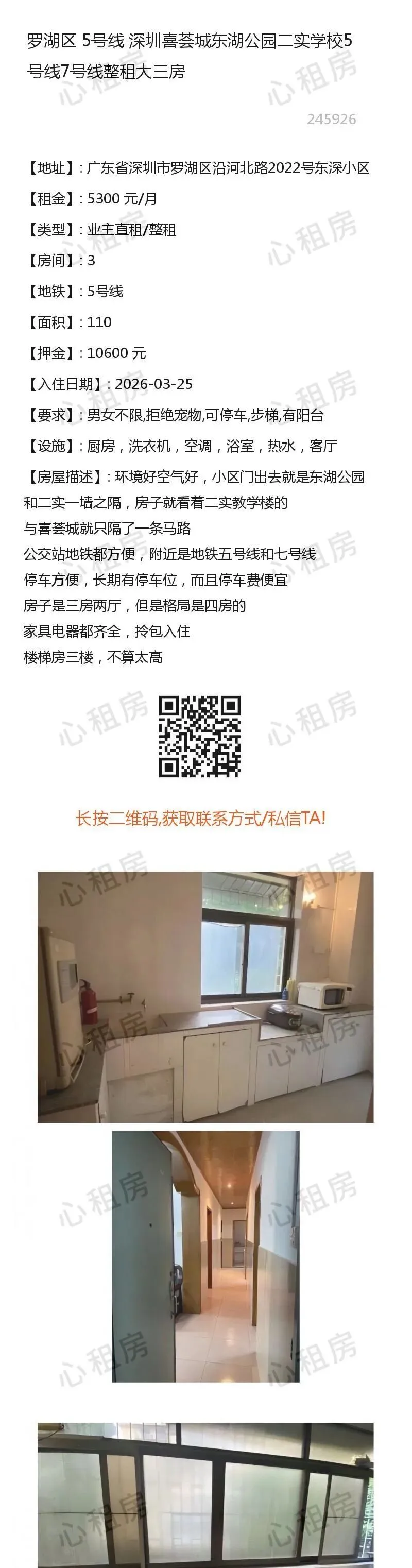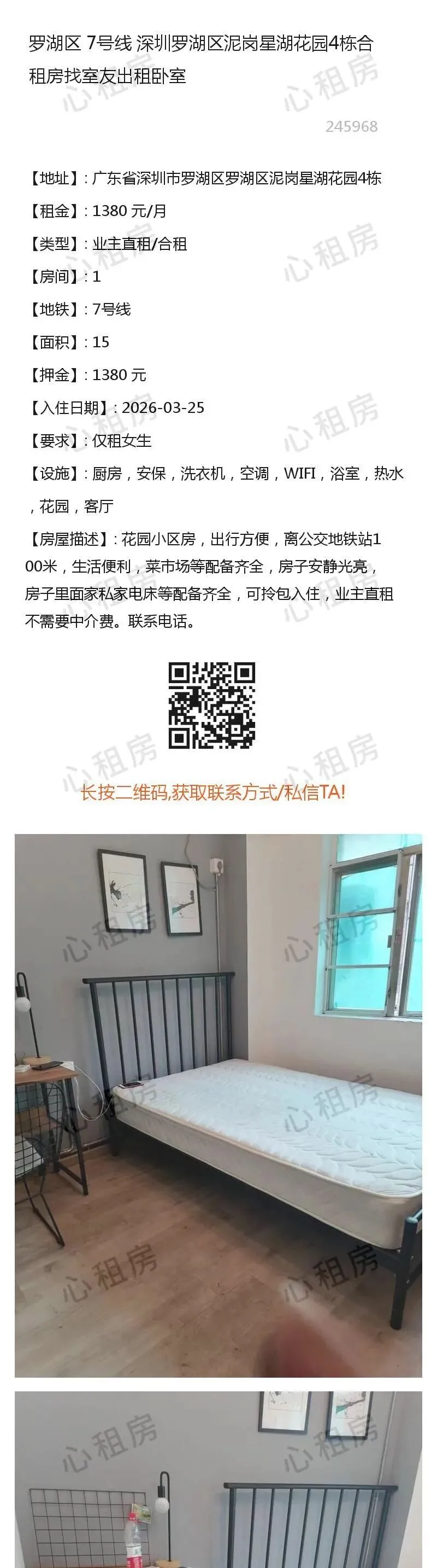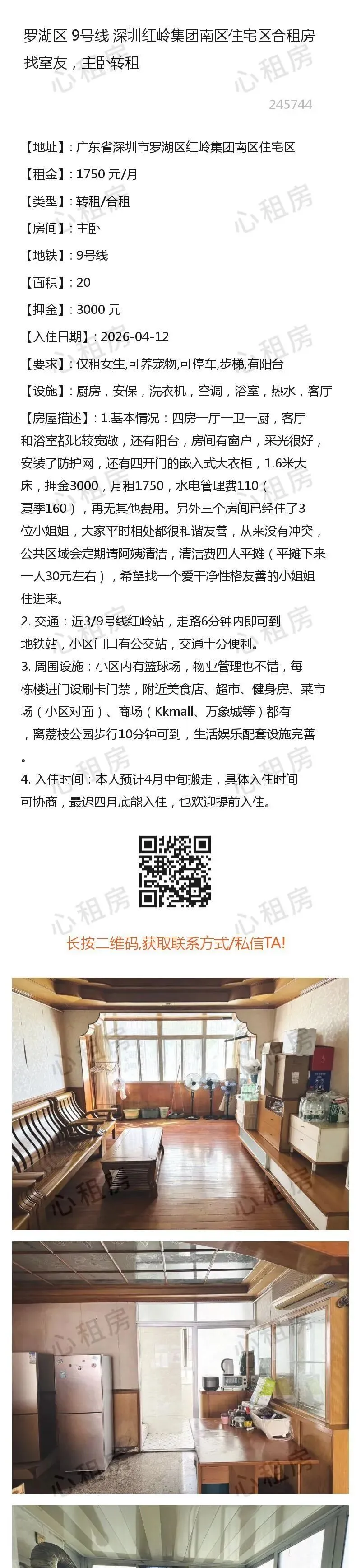 深圳租房>>罗湖区7号线深圳罗湖区泥岗星湖花园4栋合租房找室友出租卧室1380元/月深圳租房>>罗湖区9号线深圳红岭集团南区住宅区合租房找室友,主卧转租1750元/月深圳租房>>罗湖区5号线深圳喜荟城东湖公园二实学校5号线7号线整租大三房5300元/月 查看不同房源→→深圳心租房公众号