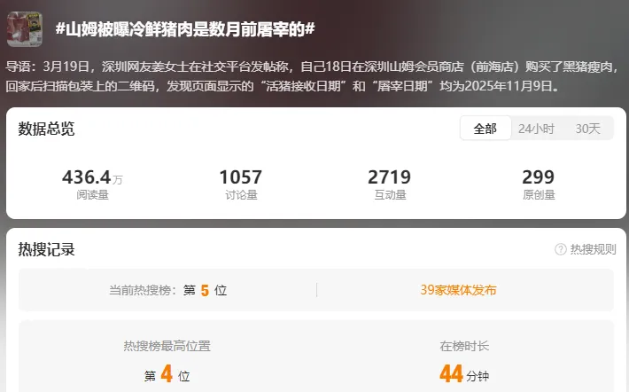 3月19日,深圳网友姜女士在社交平台发帖称,她于18日在深圳山姆会员商店(前海店)购买了黑猪瘦肉和猪肋排,回家后发现黑猪瘦肉的猪是2025年11月9日宰杀的。
