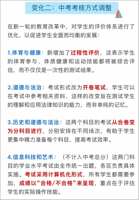 基于素质导向,今年物理、化学实验操作考试分值调整为20分,中考总分为630分;体育与健康科目增加过程性评价,现场考试实行“三大类(16小项)各选一项”。为减轻考生负担,道德与法治科目由闭卷笔试调整为开卷笔试。