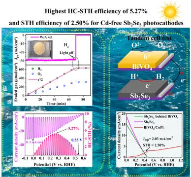 课题组此前基于(Zn,Sn)O无镉电子传输层(ETL),实现4.32%的半电池太阳能-氢能(HC-STH)转换效率(Advanced Functional Materials 2024 2420912,影响因子19,自然指数期刊,中科院JCR一区,Top期刊)。本研究首次设计原子层沉积法制备(Zn,Ti)O三元氧化物作为ETL,通过Zn/Ti比例优化与关键异质结界面热处理工艺,有效提升电子浓度,构筑理想的“spike-like”型 Sb2Se3/(Zn,Ti)O异质结能带排列,从而实现电荷分离和传输效率的同步提升。据此构建的Mo/Sb2Se3/(Zn,Ti)O/Pt光阴极在酸性电解液中呈现31.1 mA/cm2的高光电流密度,HC-STH转换效率高达5.27%,代表目前已报道的无镉Sb2Se3光阴极的最高能量转换效率。同时,构建Sb2Se3-BiVO4光阴极-光阳极串联体系,在无外偏压条件下实现2.50%的全电池太阳能-氢能转换效率,并展现出优异的工作稳定性(持续光照10小时效率衰减小于7%)。该研究可为新型高效环境友好太阳能光解水制氢提供重要材料基础和关键技术支持。