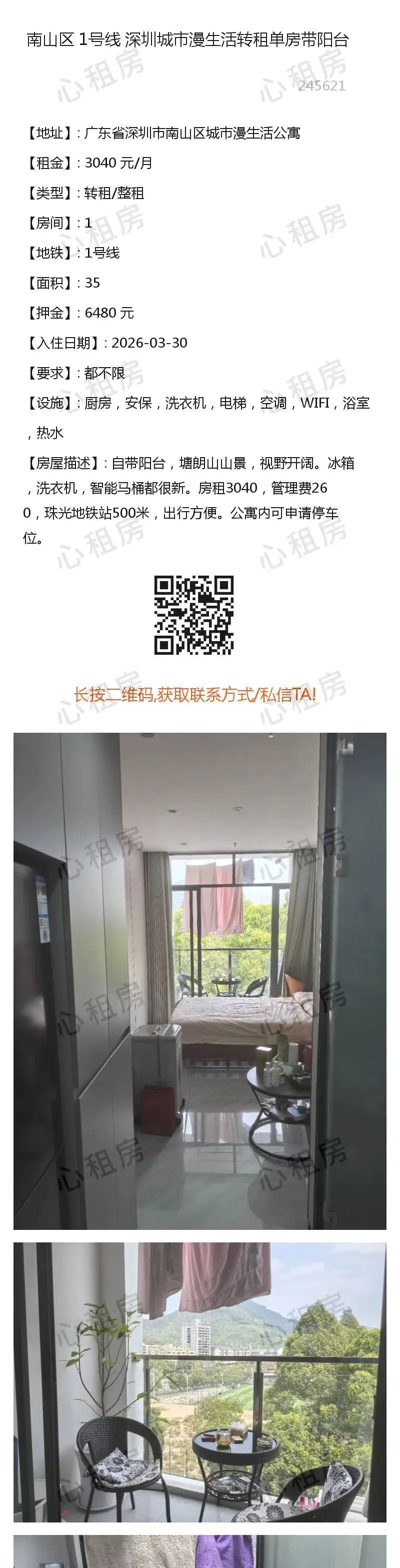 深圳租房>>南山区1号线深圳城市漫生活转租单房带阳台3040元/月