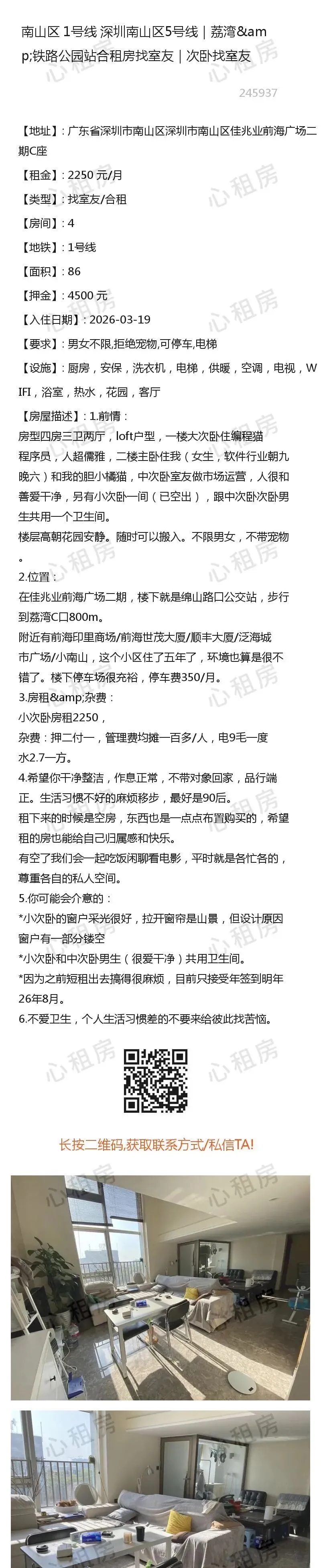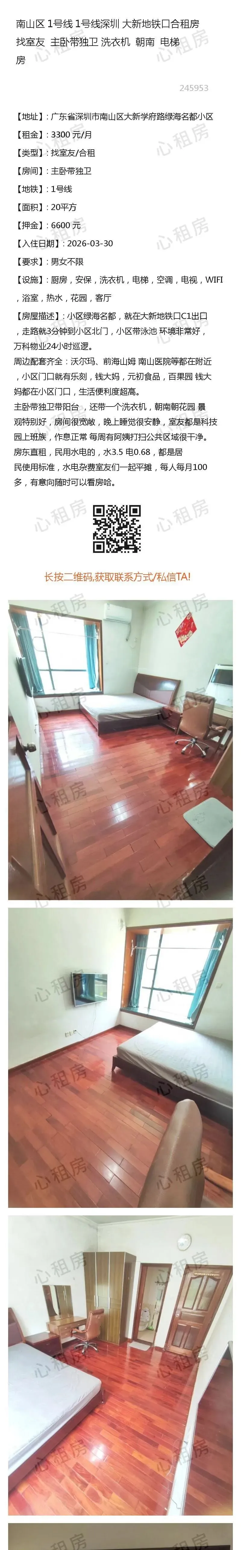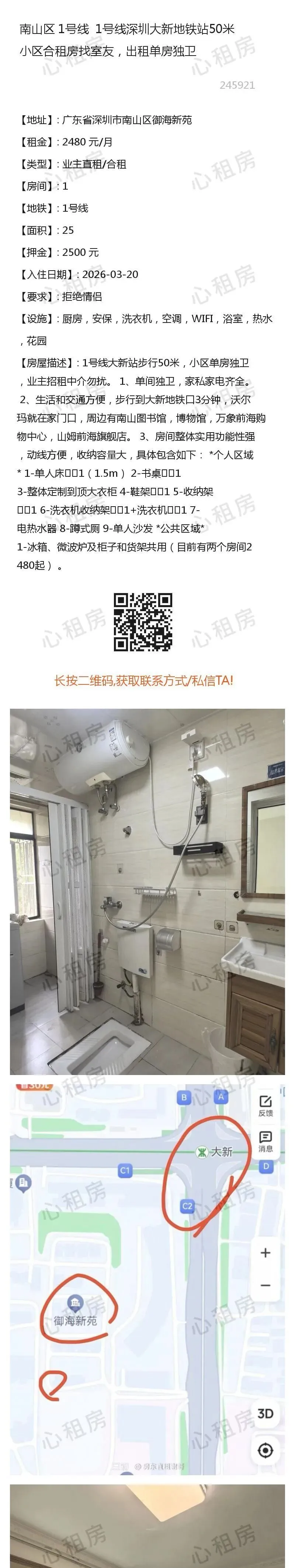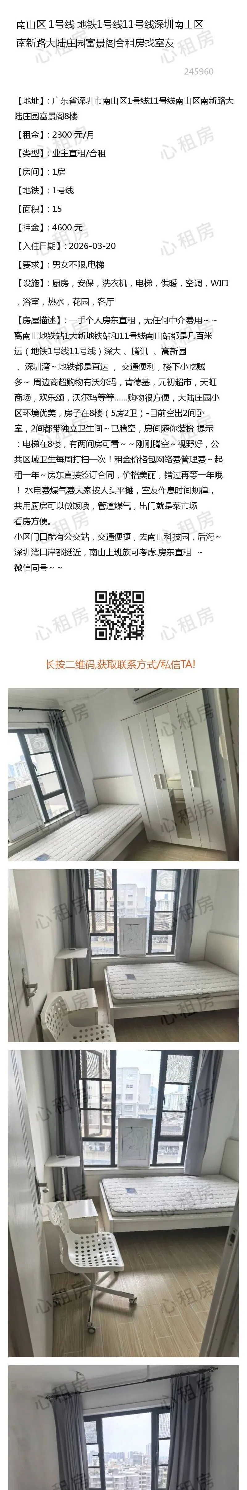 深圳租房黑房东找房子罗湖合找室友合租短租深租房科技园深大豆瓣南山租房地铁租房龙华新福田罗湖光明新区坪山新区大鹏南山豆瓣1、所有房源信息均由网友投稿,委托本公众号/心租房(homhere.cn)发布,房源的真实性、合法性由提供者负责。2、请务必核实双方身份信息(身份证)、房产权属(产权证明)、转租权利(租赁合同)等基本信息。3、请务必实地考察房源并确保与出租方提供的基本信息一致。4、切勿轻易支付定金、保证金、打赏等,建议签订《租赁合同》后再进行交易。5、双方在房屋租赁过程中产生的一切纠纷,均与本公众号/心租房(homhere.cn)无关。6、近期欺诈团伙在境外以相亲交友、租房、国际包裹等名义实施杀猪盘、诱导下载未知app等进行刷单返利等欺诈的行为较多,请先确认对方身份,保护个人隐私和财产安全。