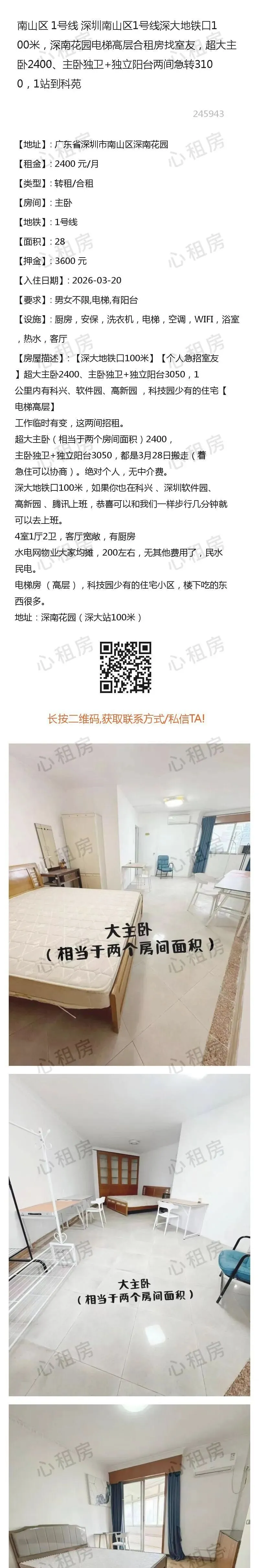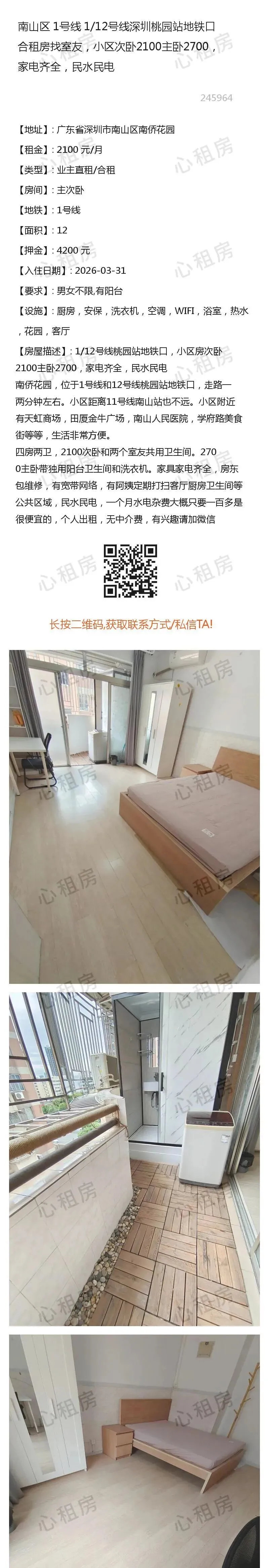 深圳租房>>南山区9号线深圳高新南地铁口10m转整租两房,新小区电梯8楼地下车库300包月,6992元/月深圳租房>>南山区1号线深圳南山区5号线|荔湾&铁路公园站合租房找室友|次卧找室友2250元/月深圳租房>>南山区1号线深圳南山区1号线深大地铁口100米,深南花园电梯高层合租房找室友,超大主卧2400、主卧独卫+独立阳台两间急转3100,1站到科苑2400元/月深圳租房>>南山区1号线1号线深圳 大新地铁口合租房找室友 主卧带独卫 洗衣机 朝南 电梯房 3300元/月 查看不同房源→→深圳心租房公众号