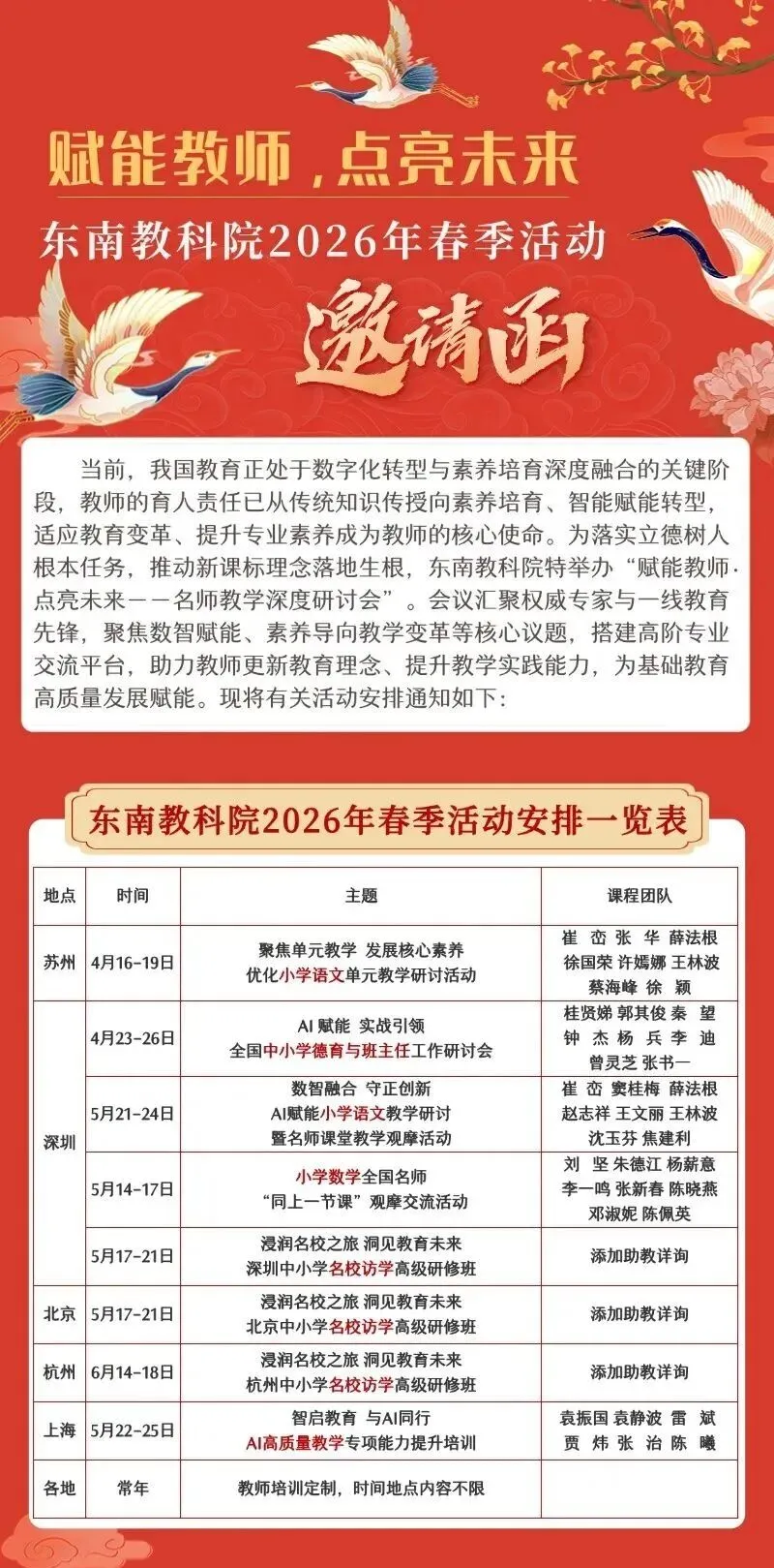 为深入探索 AI德育发展路径,挖掘 AI 技术与班主任工作的融合潜力,进一步提升中小学班主任核心能力,为班主任搭建学习交流、经验共享的专业平台,东南教科院将于4月在深圳举办全国中小学德育与班主任工作研讨会暨主题班会课观摩交流活动。本次活动聚焦学校德育建设、带班技能解锁、班主任成长、沟通艺术及心理健康等关键维度,邀请全国知名德育专家、名班主任亲临授课,通过主题班会课观摩、专题讲座分享的形式,为广大德育工作者和班主任传授前沿理念与实操方法。