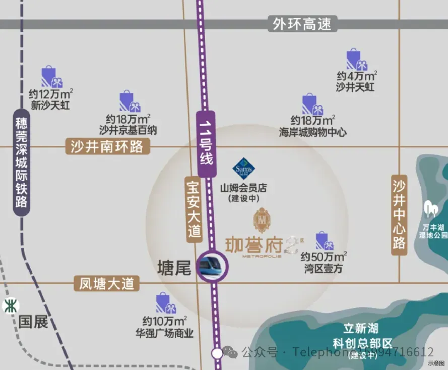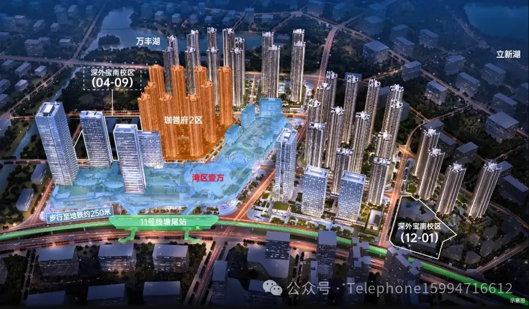 交通配套:位于深圳宝安,享有三大国家战略规划叠加的优势,是湾区价值的重要体现。项目紧邻11号线塘尾站,交通便利,可快速到达南山、福田等核心区域。同时,周边还有规划中的30号线以及大型“空铁联运”的综合交通枢纽,未来出行将更加便捷。商业配套:项目周边拥有约50万平方米的“湾区壹方”购物中心和约10万平方米的“熊出没”主题华强广场,以及宝安首家山姆会员店和海岸城18万平方米商业,商业氛围浓厚,为居民提供了丰富多彩的购物与休闲选择。