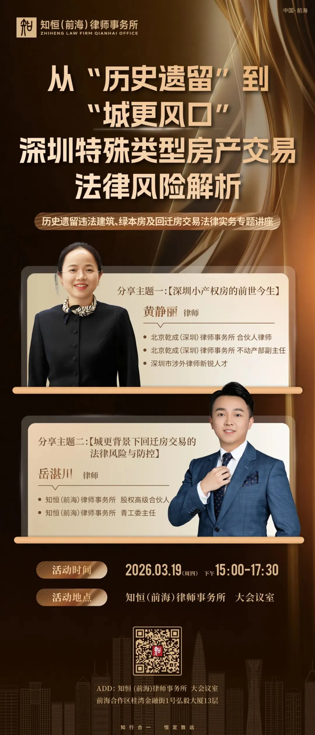 2026年3月19日,知恒(前海)律师事务所(以下简称“知恒前海”)聚焦深圳城市更新背景下的特殊类型房产交易痛点,成功举办“从‘历史遗留’到‘城更风口’—— 深圳特殊类型房产交易法律风险解析”专题讲座。