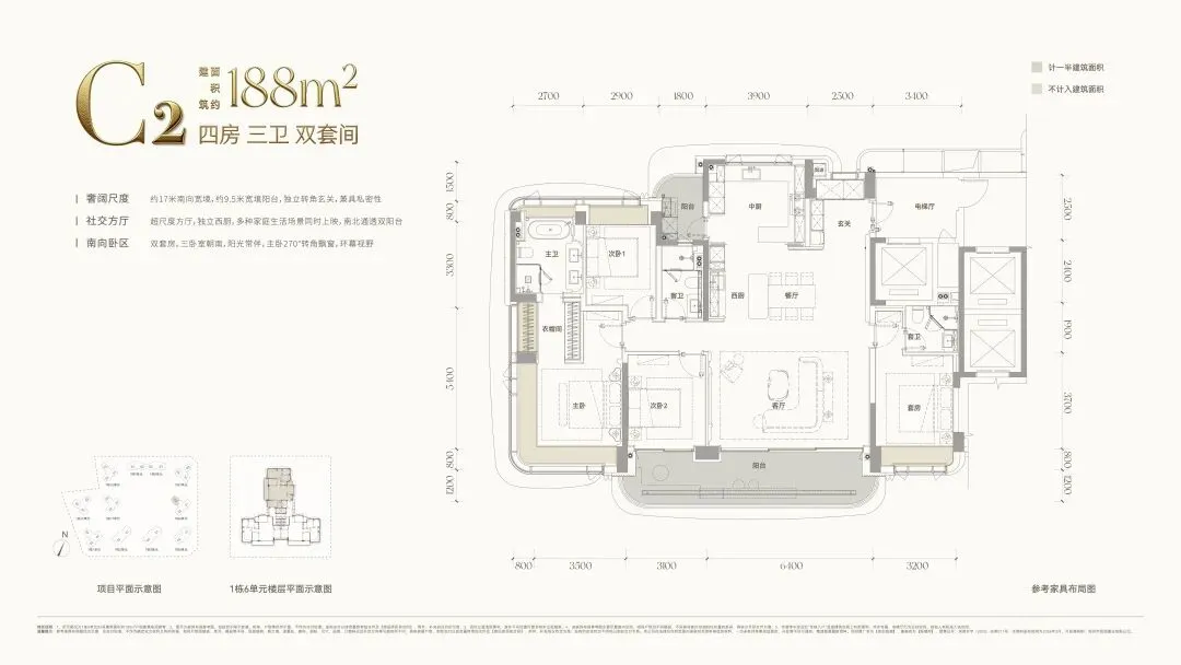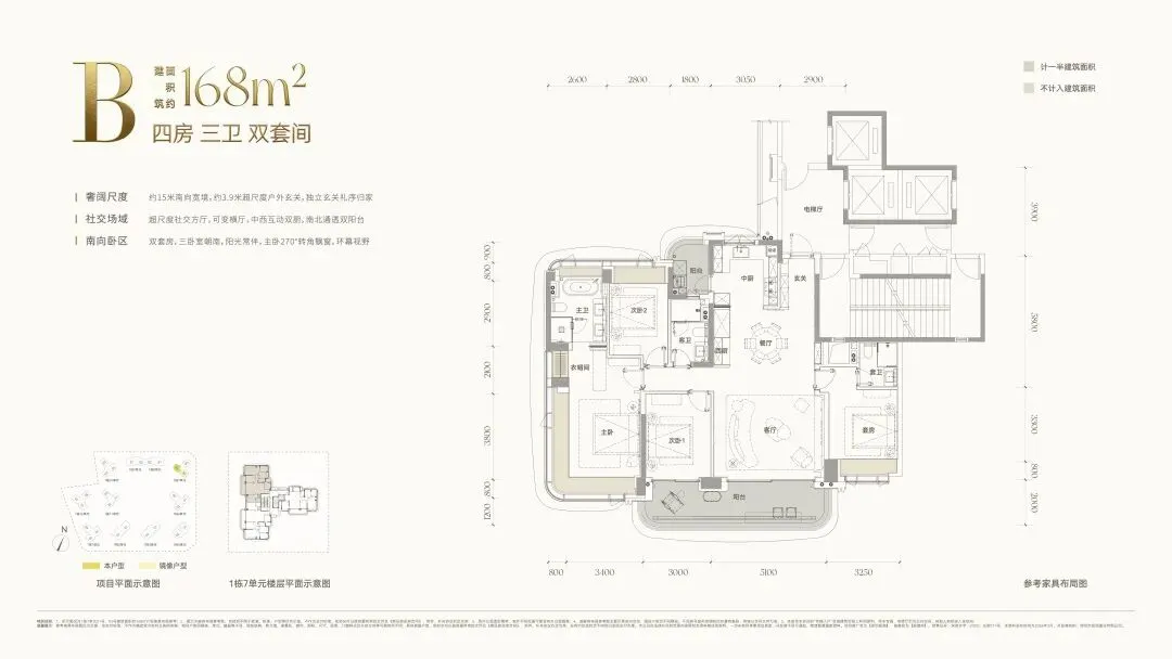 188㎡户型都是通透设计,均位于1-6栋,在小区东侧,T3品字形结构。基于楼栋结构分了两种户型(C1/C2),总体都非常相似。该户型有点像245㎡的简致版本,同样地客厅有充足的开间可以增设多功能空间,餐厅也有西厨的位置。其中C1有两户,主阳台东南,景观不错,尤其是东端户,算是宝中唯一没短板的产品,集地段+配套+实用空间+景观+KFS品牌于一身。而C2的188㎡主阳台西南看小区中央园林,背面看宝中西部商务区城景。- 168㎡四房三卫(双套间)通透B户型