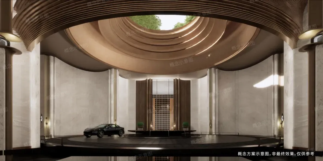 主入口设计了车马院,内外做了双水盘环岛,内环岛专属归家落客。通道两边有净高9米的桅杆造型立柱提升空间场域,再以8株稀有乔木点缀引入勃勃生机,有“九五至尊”、”八方来财”的美好寓意。