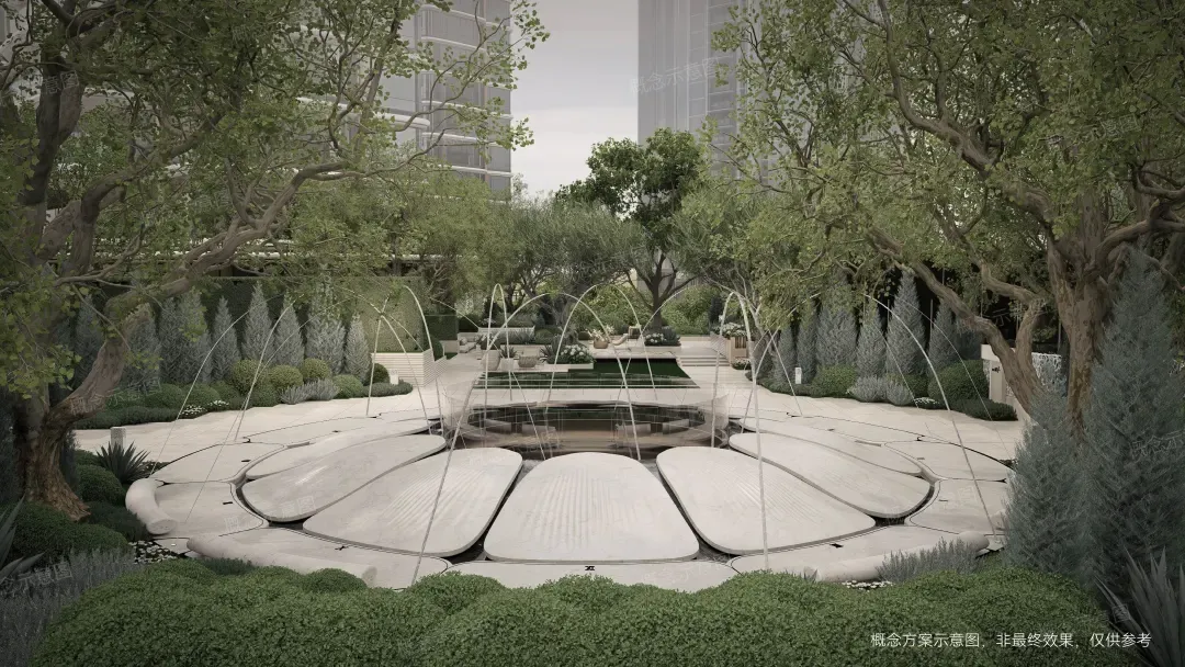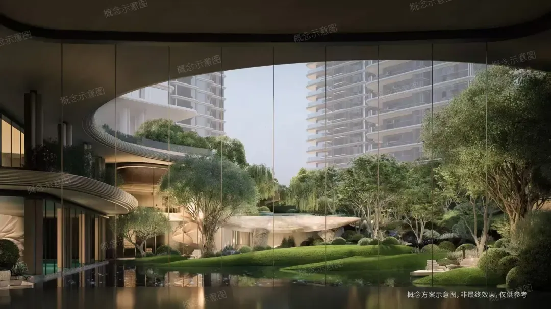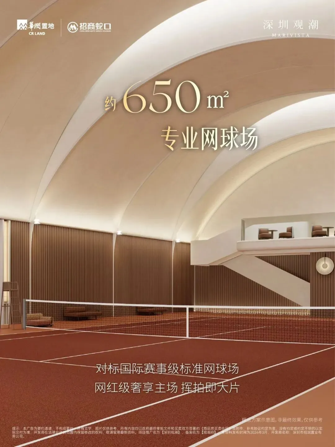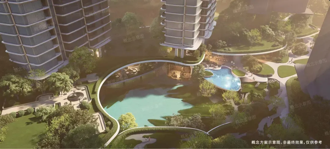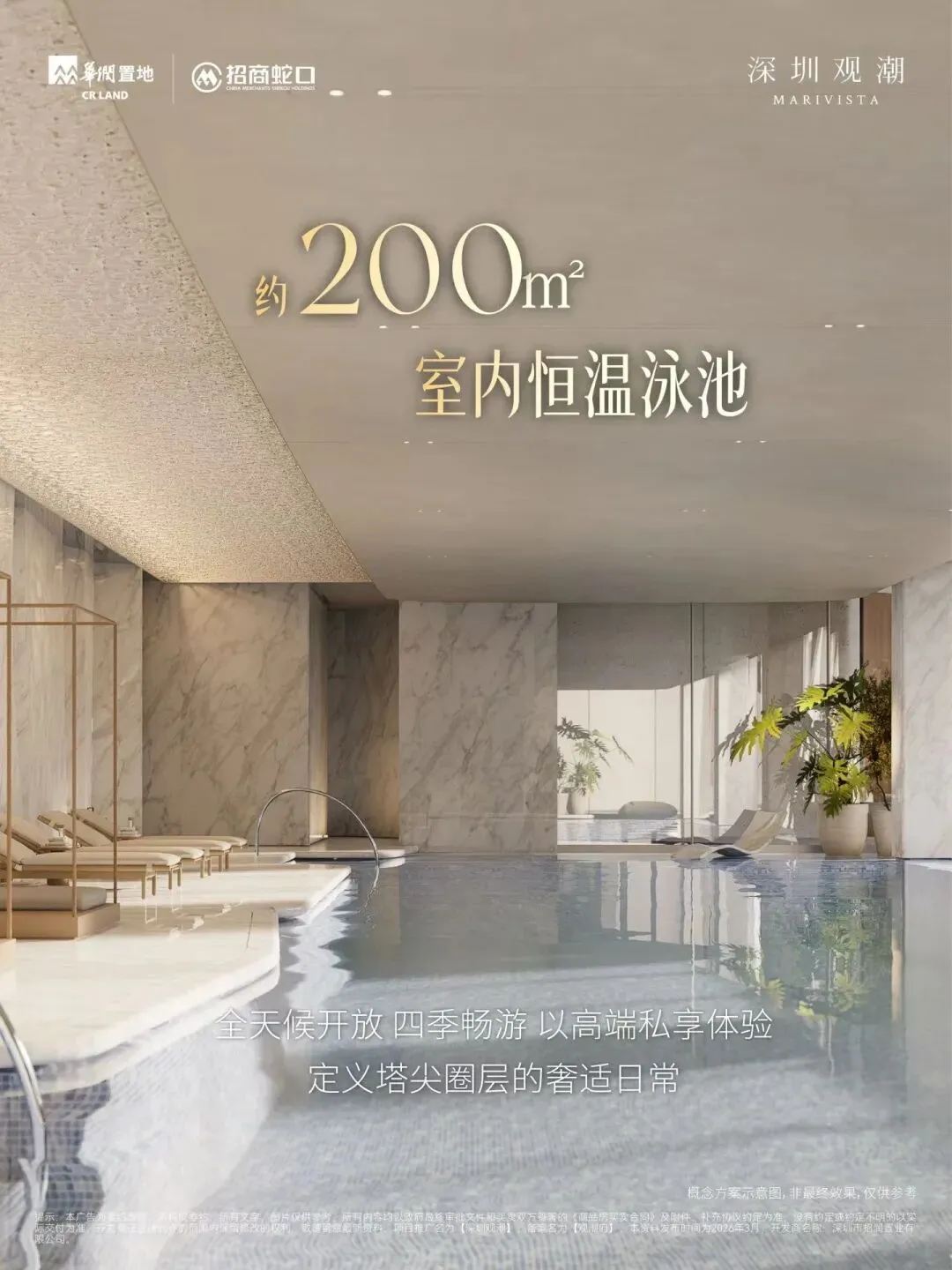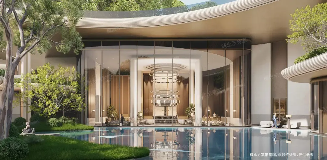 车马院设计了天圆地方的穹顶,能透入自然天光,渗透到转盘的水景。这方面设计也跟我聊到,这个景色在不同时辰和季节呈现的水波斑纹都会不一样,旨在营造不同的自然声息。穹顶的上方是小区的顶层园林,可以看出这个立体园林设计,是为了在尽可能扩大住户可以足达的漫步空间。底盘外围除了归家大门和次出入口,最显现的就是约1.8万㎡的双层滨海街区式商业,体量跟东京「麻布台之丘」的底商相近。这个设计有别于过去传统底商,而是运用好华润的商业经验。预计由万象生活招商,能给到深圳目前街区商业最顶尖的商业运作和品牌进驻。另外据悉万象今年还会把宝体的运营权拿下,届时宝中的体育场馆将会更上一个台阶。对内是商业里街,穿梭在底盘外围,同样有门禁业主们可以从小区花园内部自由出入,有点小区二层对外衔接整个宝中的滨海连廊,空中连接欢乐港湾、滨海文化公园、宝中其他大型配套。按照目前释放的消息,「深圳观潮」的会所是为业主打造的圈层社交空间。在不同空间有丰富的社交属性,比如商务社交、健身社交、儿童社交,据悉是只开放给业主私享。会所规划方面,除了基操的棋牌室、茶室、宴会厅、Party House功能以外,还有健身房和泳池,其中室内恒温泳池是约25×8米水面。户外还有一个小孩专供的心形戏水池,寓意为“蔚蓝宝石”,其递进深度最深水位在45cm左右。戏水池旁边有一个约200㎡左右的家长休息处,在小孩水上狂欢的时候,当爹妈的也能舒服地在一旁静静刷个剧。小区有球场不算新鲜,不过能够利用大底盘做到室内双球场的,在深圳哪怕是豪宅项目都不多见。「深圳观潮」的超级底盘除了街区商业、立体园林、会所配套之外,还有一个室内篮球场 + 一个室内网球场。过去大多项目都只做室外球场,平时大家使用的时候难免产生噪音影响,「深圳观潮」这次直接卷成了室内球场。深入内部抵达小区园林,共设计了约5.5万㎡的三层复合庭院,亮点是超开阔的尺度感,对于一个占地4.25万㎡住宅能做出130%的园林占比,户均园林面积约90平米,放眼整个深圳都不多见。我们在建模的时候研究中央庭院设计中看到,三层庭院并非明确的分割楼层,而是上下坡度和转折融合,让人在散步中不经意间穿梭在各层之间,移形换影。正如上文设计所言,园林为“森海”之意,即丰富的绿植 + 大型水景。如果住的是看园林朝向的户型(如168㎡户型西南向),整个花园的观感也不输外景。小区内有两处有设计造型的大水景,心形的是极具辨识度的戏水池,中央是约800㎡的大型水景,旨在多个角度看都有深海谧境的感觉。从会所空间望向园林,或是从园林回望会所,都会看到这道“海洋之心”水景。 商业配套