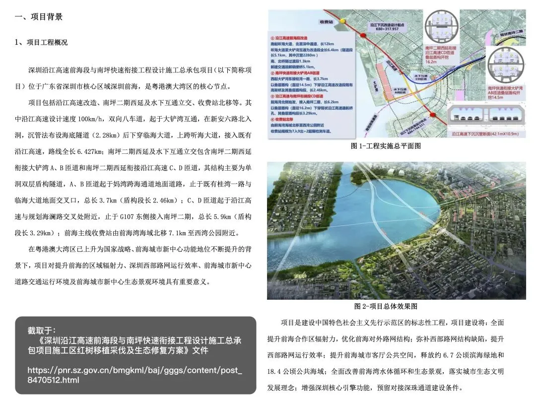 「深圳观潮」西侧还规划了一条临江大道(原海滨大道),西向深圳机场,东接南山前海滨海大道。这条路早在2020年获批,连接宝中和前海桂湾的水下隧道,现在没钱可能没那么快可以兑现。而关于沿江高速方面,其实早在2021年就打算落地规划了,而事实上当年把红树林的移植和生态修复方案也一并弄了。至于后面为啥没有动,归根到底大概还是钱的问题。另外临近的路口在建连接大铲湾腾讯岛的跨海引桥,建成后两点路程只需要8分钟。跨海桥连接宝安中心Vivo总部楼下裕安一路和腾讯岛纬二路,对于两岸来说是一个利好工程,进一步拉近了宝中和腾讯岛的交通距离。公共交通方面,宝中有三条到达率极高的地铁线贯穿,还临近所谓的“深圳一环”的前南环线(15号线)。