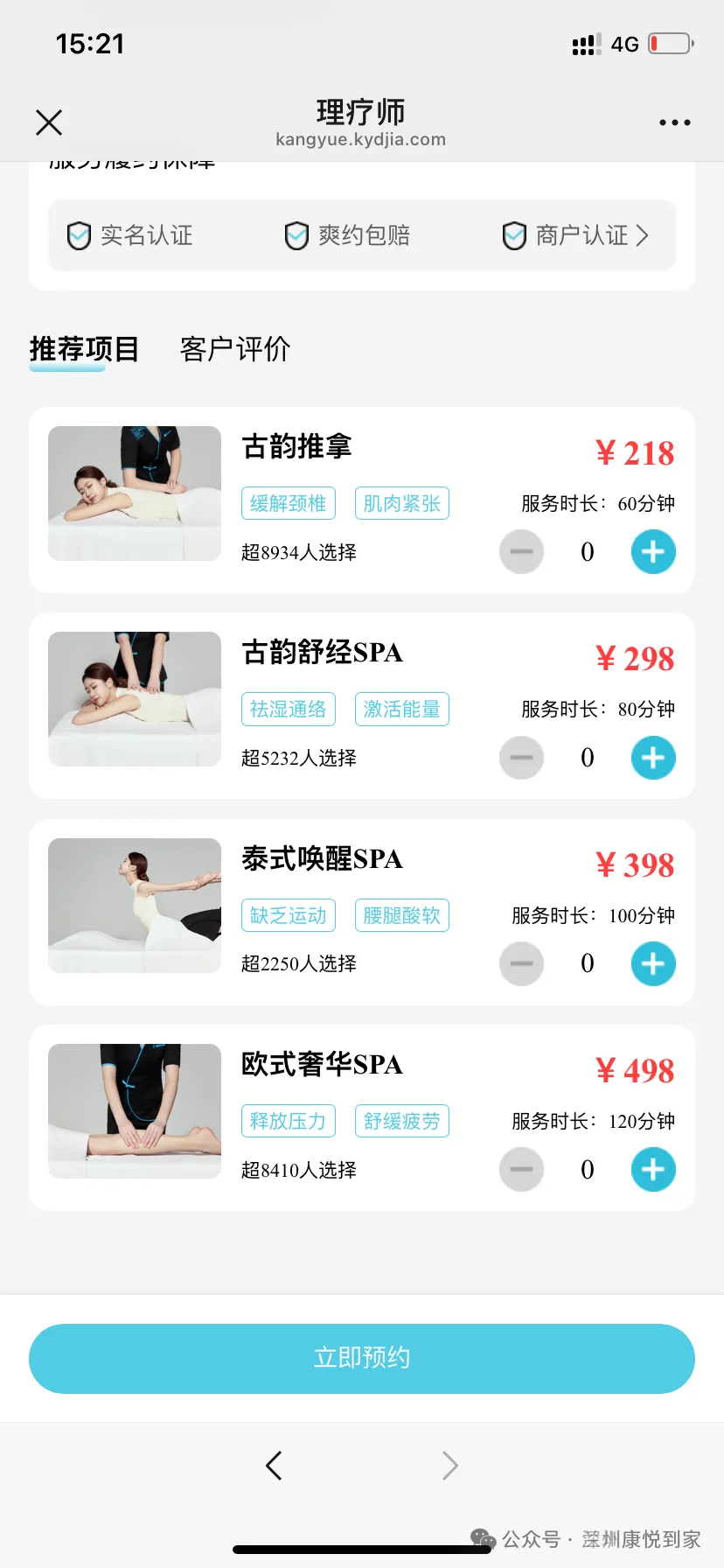 进入公众号之后,点击“立即下单”,即可查看项目详情和理疗师详情。