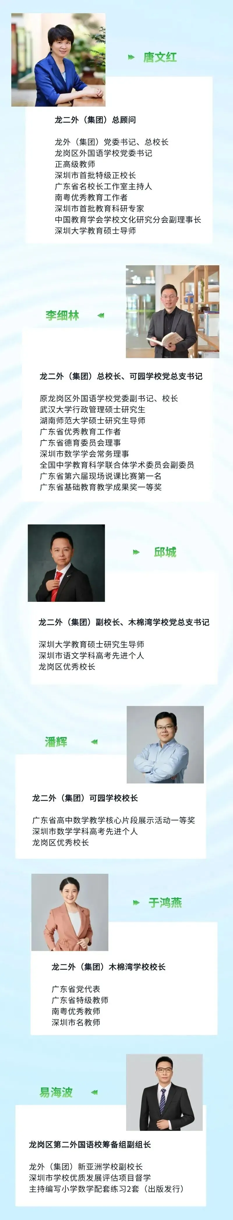 我们不止于组建一个教育集团,更致力成为新型集团化办学的先行者、品牌推广的实践者、育人方式的变革者、高品质教育的引领者。为加速迈向高质量发展,集团还与广东省首批优质集团——龙岗区外国语学校(集团)达成“美好教育”战略合作,并聘请龙外(集团)党委书记、总校长唐文红女士为集团总顾问。站在省优集团的“巨人肩膀”上,你将直接对接优质教育理念、先进教学模式、专业教研体系,名校长领航指导,大咖团队并肩同行,专业成长一路开挂!