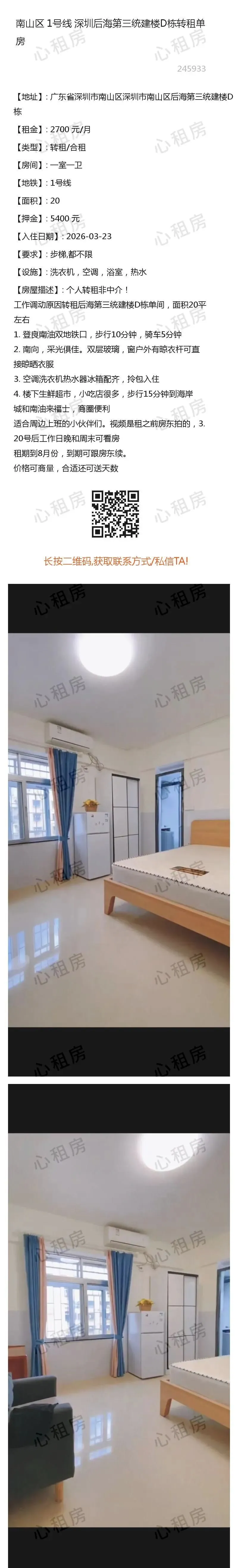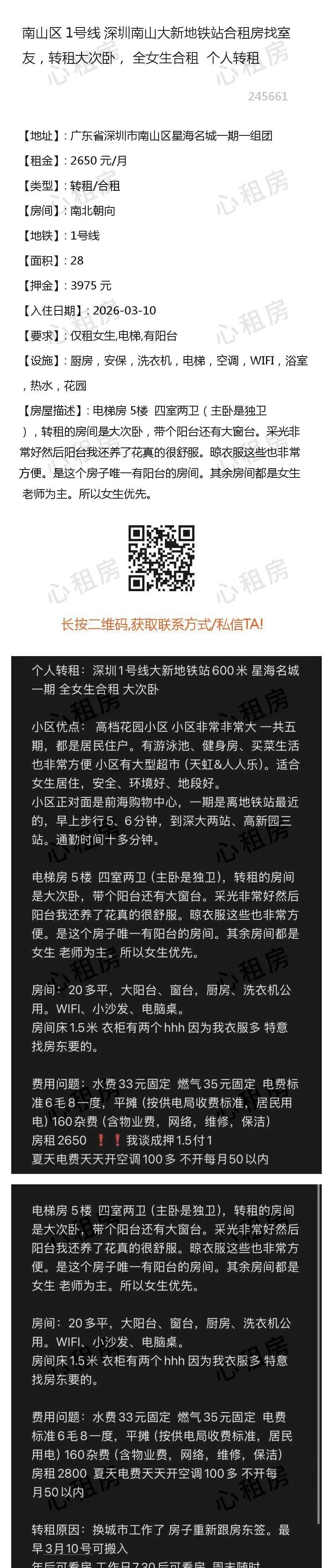 7、近期有人冒充我方线下工作人员,在此特别提醒:本公众号/心租房(homhere.cn)仅提供信息发布,不存在线下工作人员提供服务,请务必谨慎、切勿上当被骗。8、切勿轻信他人,点击他人提供的链接、二维码等,切勿按照他人指示提供验证码、进行转账等操作,谨防上当受骗。9、如遇提供虚假信息、冒充我方工作人员、引诱点击其他网站链接、实施诈骗等行为的,请及时在本公众号对话框里回复:Y,与我方客服联系。