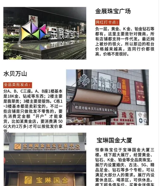 不过我得跟你说实话 便宜归便宜 水也真不浅 第一次去的人很容易被绕晕 你看着满街都是金店 金展珠宝广场啊 水贝万山啊 宝琳国金大厦啊 每家看起来都差不多 但进去之后才发现门道多得很 有些档口主要卖投资金条 有些专做古法金 还有些是做5G黄金的 你要是连这些基本概念都不懂 就直接冲进去问价 人家一看就知道你是小白 报价能不能给你实在点就两说了