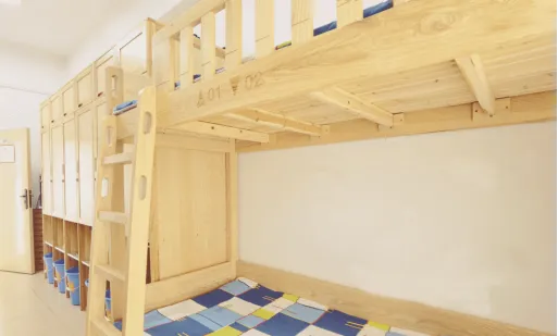 6人间,实行寄宿制管理,配备原木家具,床铺、衣柜、洗手间、洗澡房设施齐备;生活区设有洗衣房、医务室、生活服务中心,心理教师、生活教师、校医、保安24小时值班,贴心服务,为同学搭建温馨家园。
