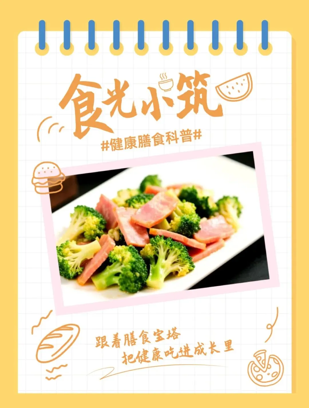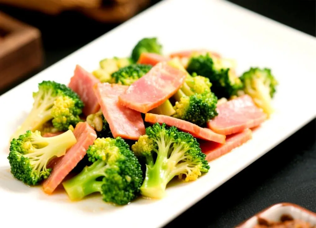 颜值与营养并存:翠绿的西兰花搭配粉嫩的火腿,色彩鲜艳,能有效提升孩子的用餐兴趣,减少挑食。