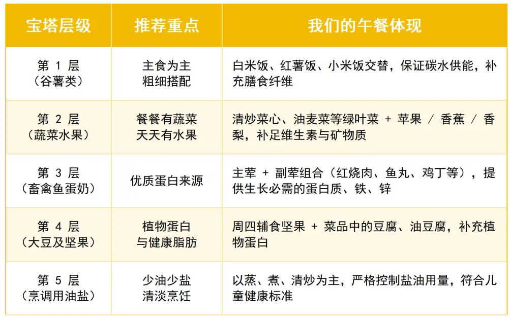 中国居民平衡膳食宝塔将食物分为 5 层,我们的午餐完美覆盖核心需求: