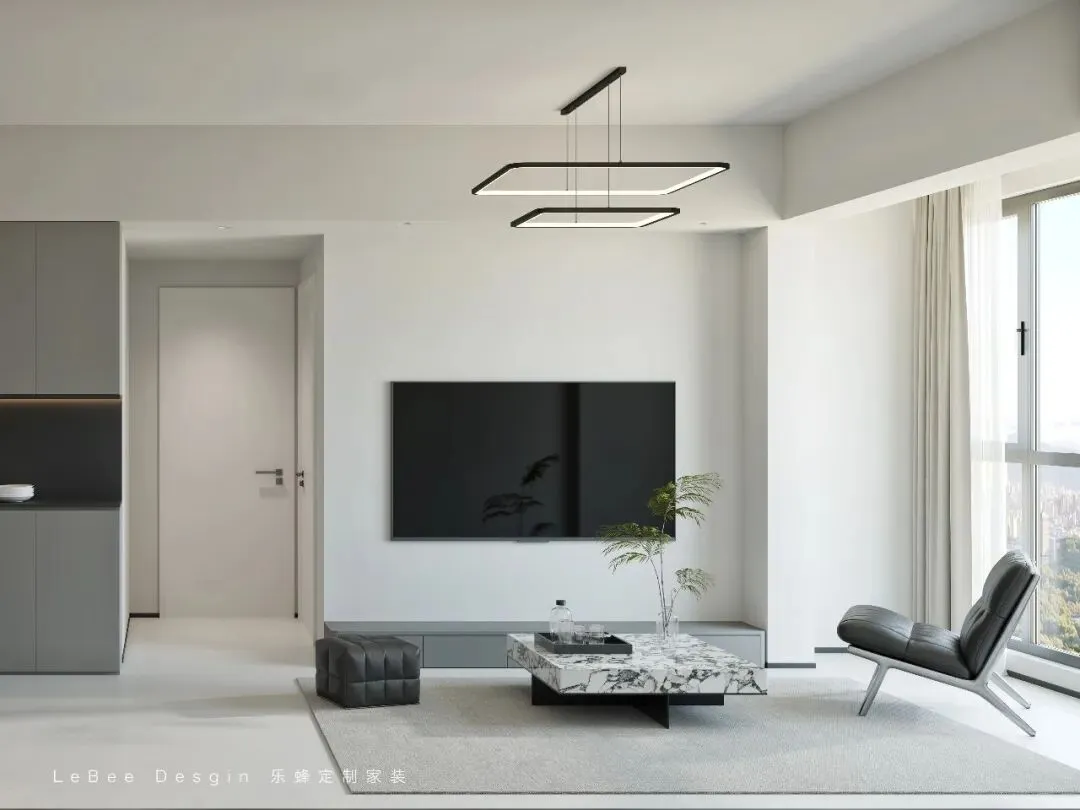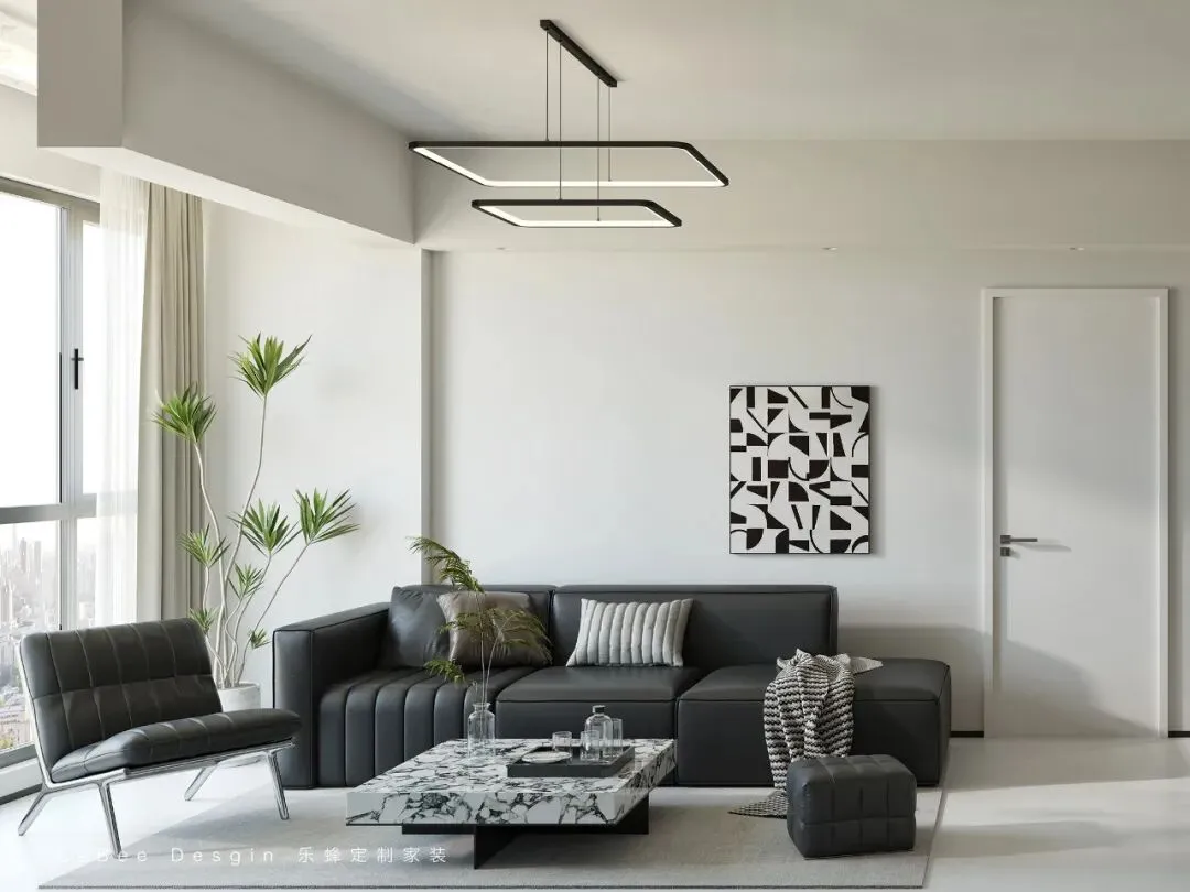 客厅双层几何吊灯成为视觉焦点,柔和光线避免刺眼,同时勾勒空间轮廓。