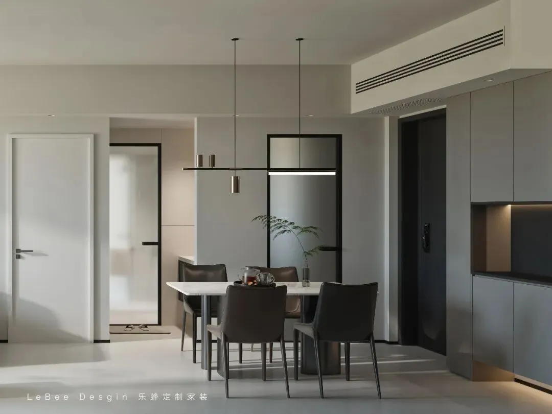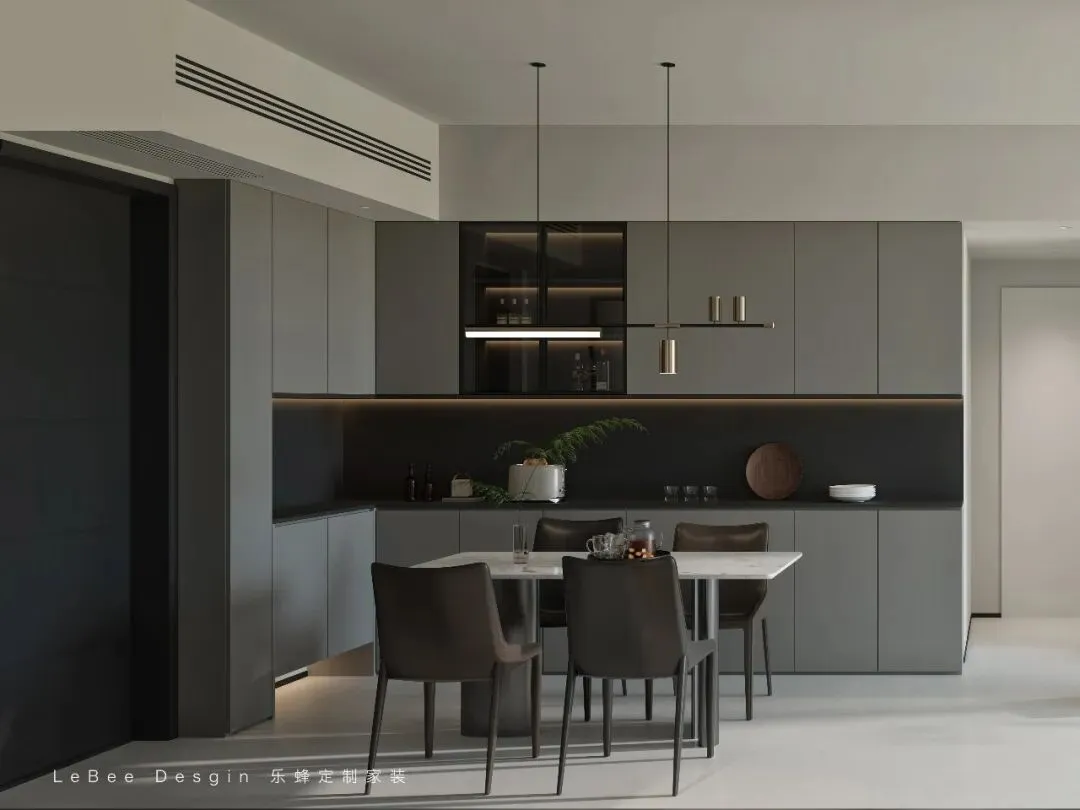 餐厅采用无主灯 + 线性灯 + 氛围灯带组合,餐厅线性吊灯聚焦用餐区,餐边柜下沿与玻璃柜内藏灯带烘托氛围感。