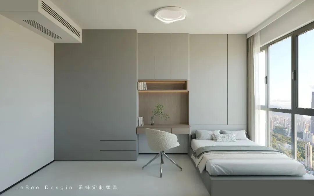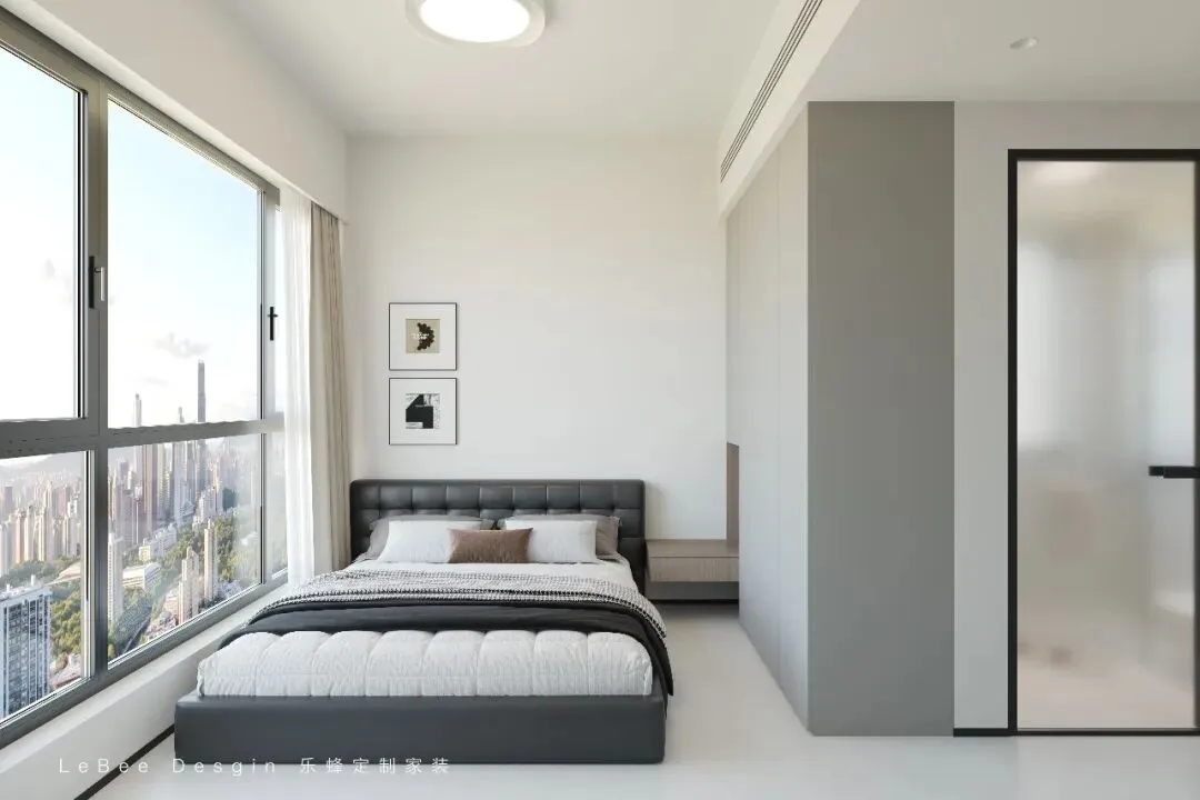 主卧以白 + 深灰 + 暖木色为核心色调,通顶无拉手衣柜 + 悬浮床头柜,将衣物、杂物全部隐藏,全景落地窗床体居中摆放,摒弃冗余隔断与复杂造型,让空间动线流畅、视觉开阔。