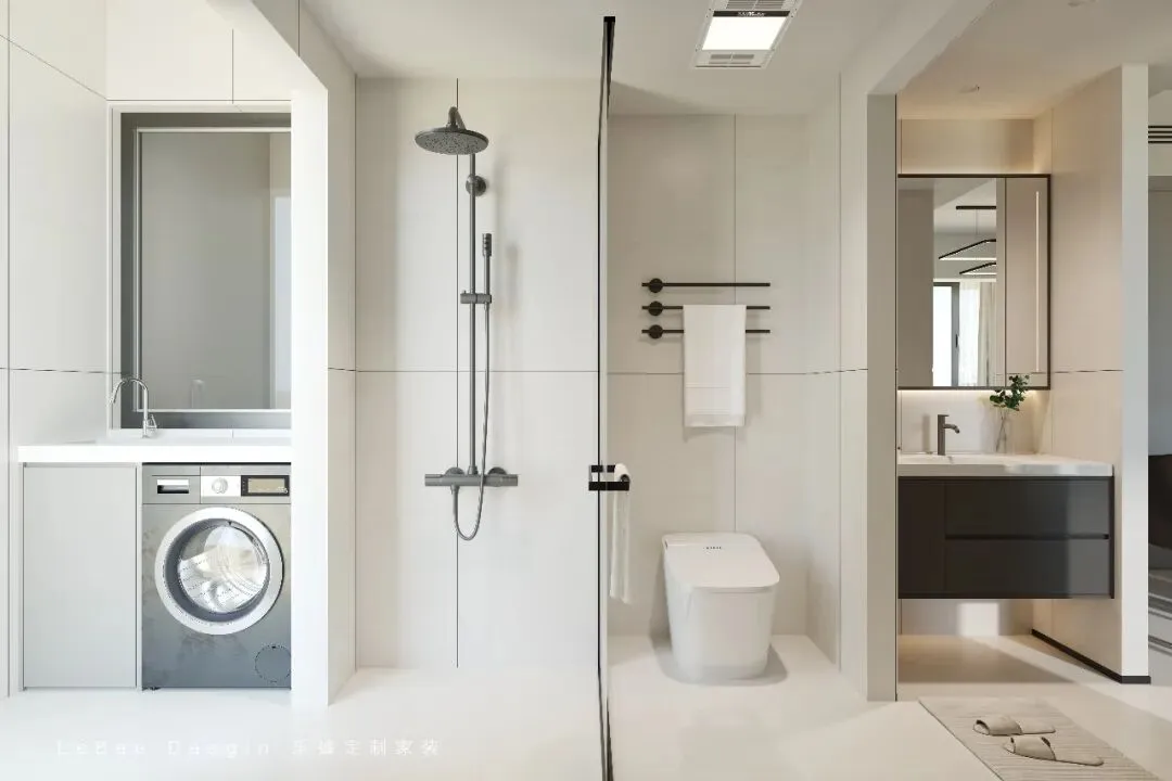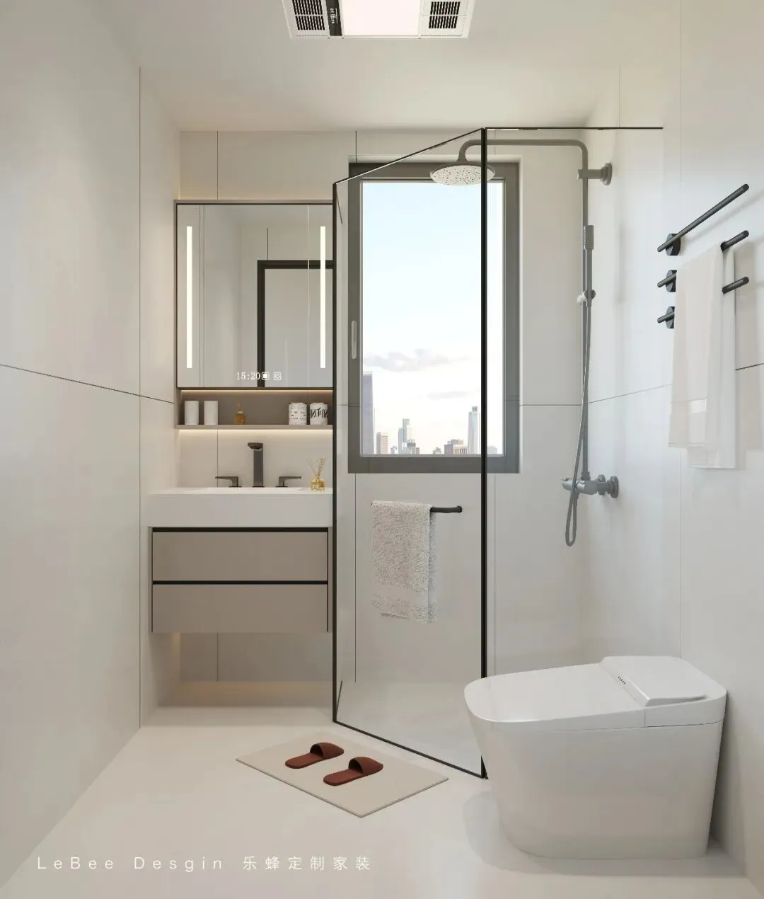 公卫通过玻璃隔断实现彻底的干湿分离,并结合三角动线布局提升使用效率;功能上则依托镜柜、壁龛与悬浮浴室柜构建精细化收纳系统,让空间时刻保持清爽整洁。
