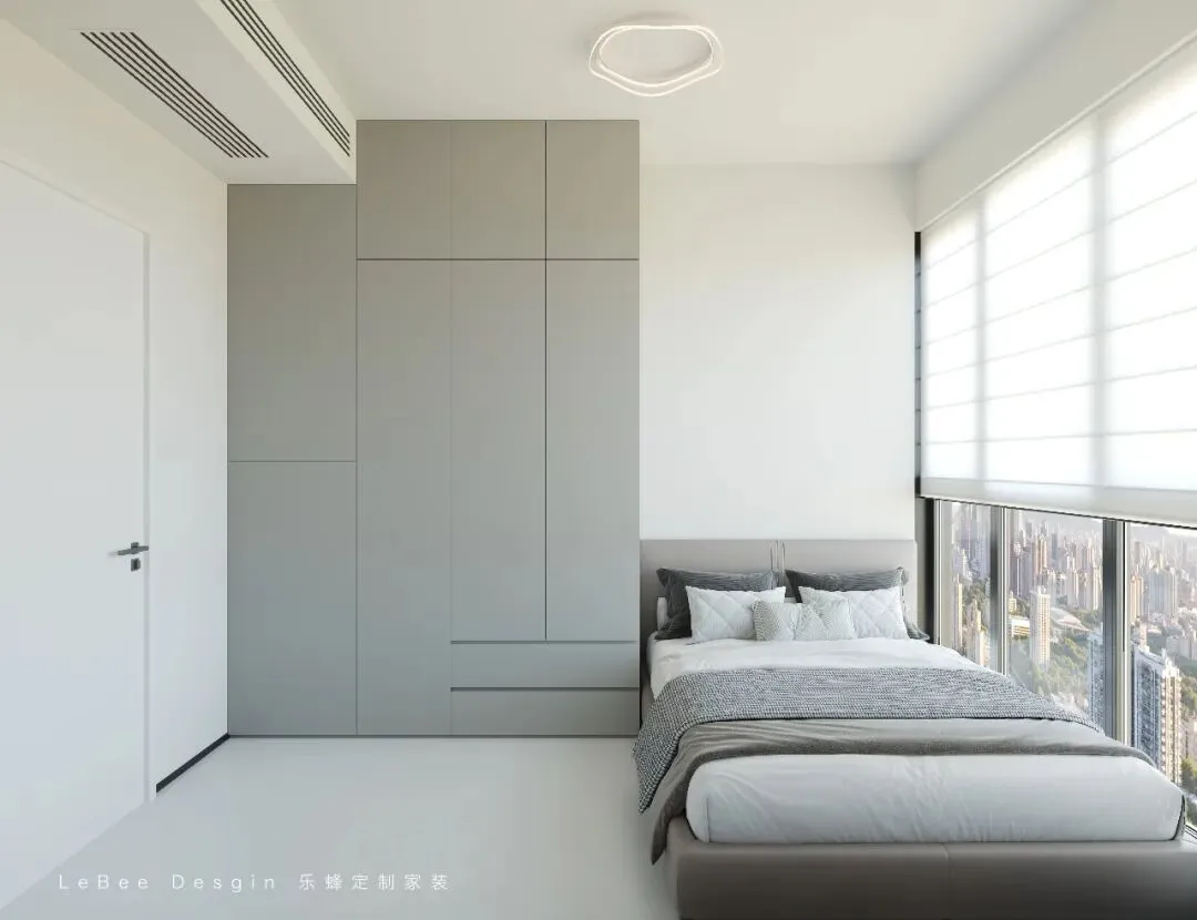 次卧采用无拉手通顶柜体设计,做到顶最大化利用垂直空间,集封闭柜、抽屉于一体,将换季衣物、日常杂物全部隐藏,既解决小户型储物痛点,又保持墙面整洁,完美契合极简 “无杂乱” 美学。
