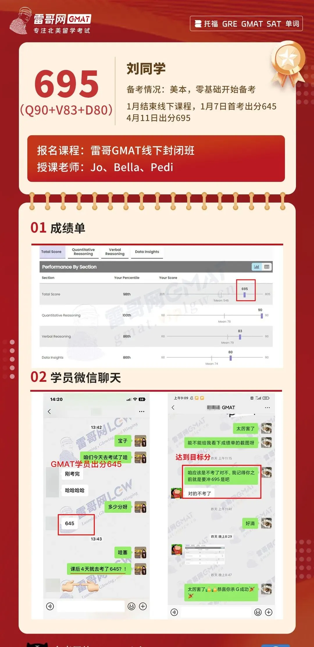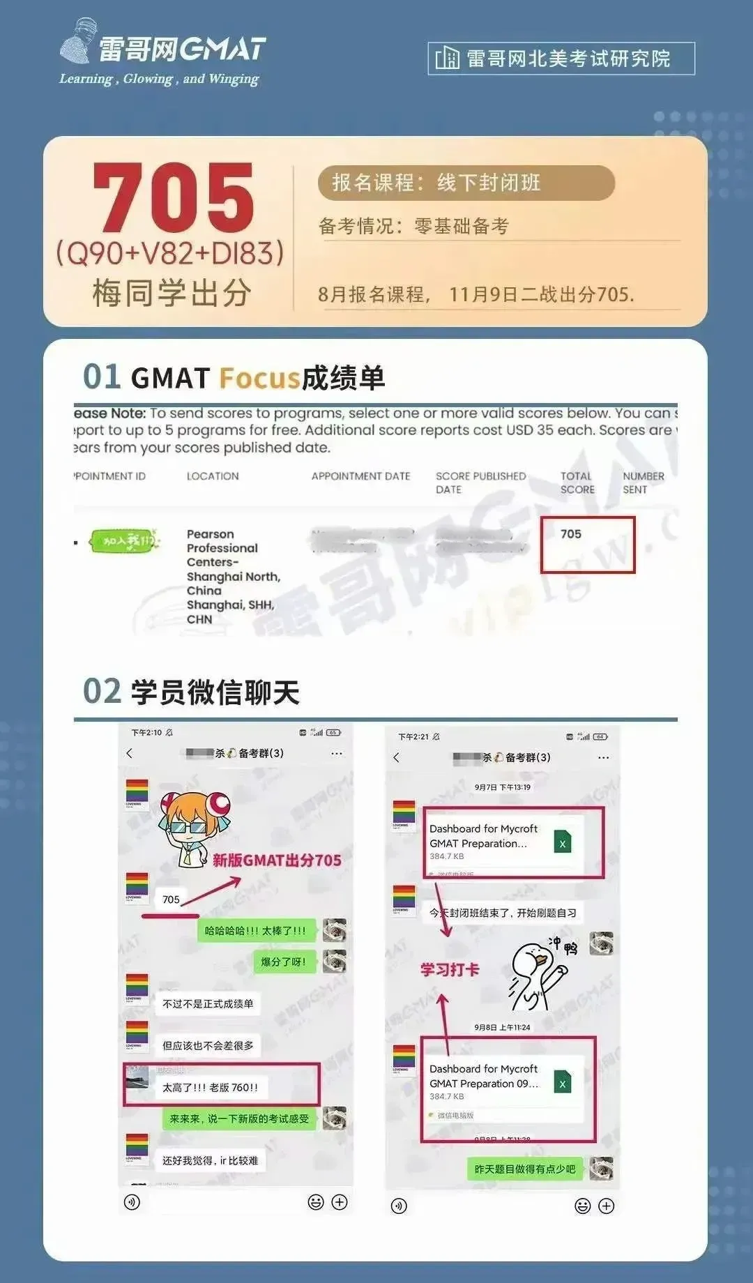 雷哥GMAT课程封闭班学员梅同学新版GMAT出分705!一起来吸一吸欧气!