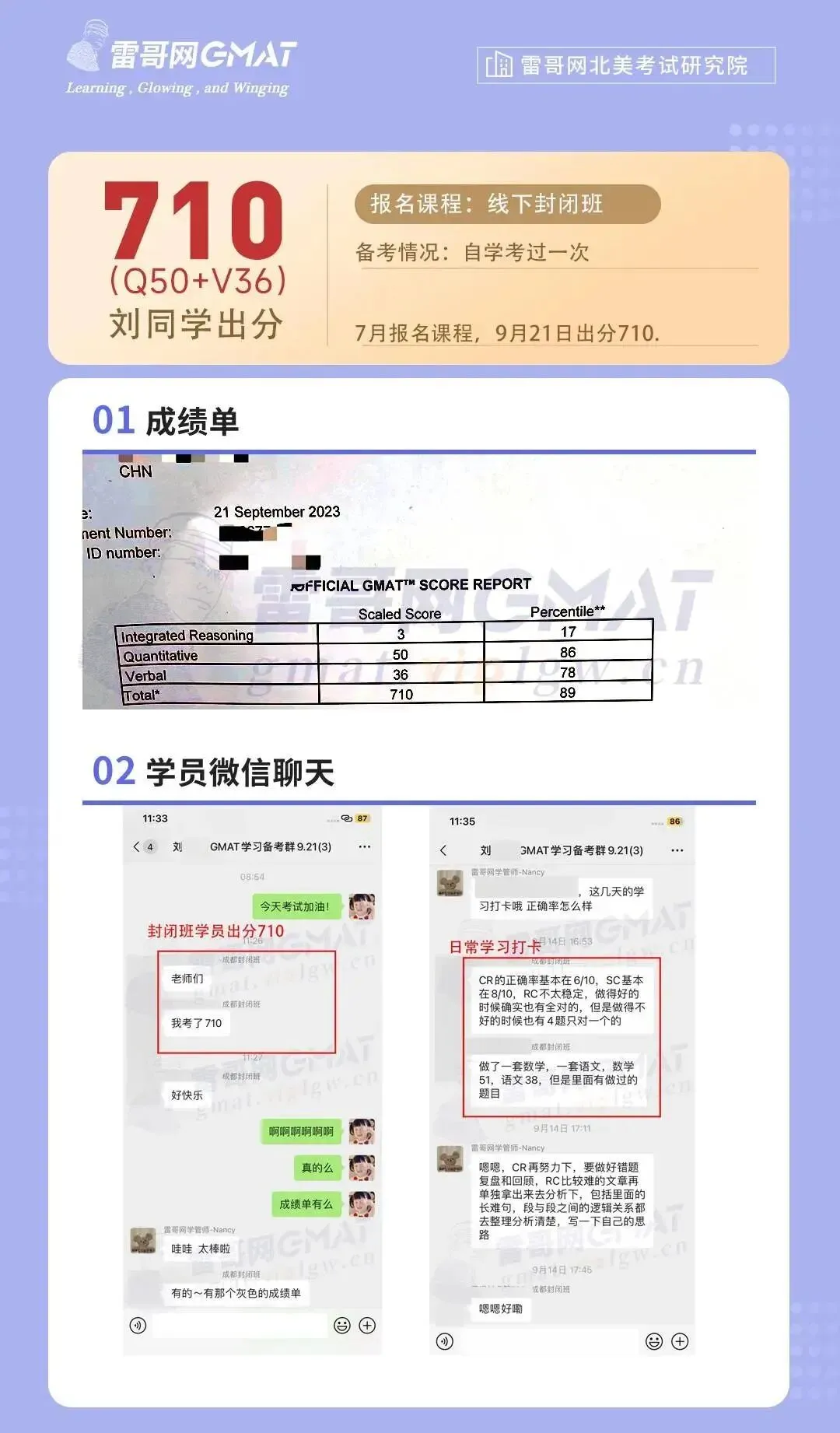 刘同学之前自学自考过一次,没有到达自己的目标分数。7月报名了咱们暑假GMAT课程封闭班,学完后9月21日参加考试成功出分710(Q50+V36)!