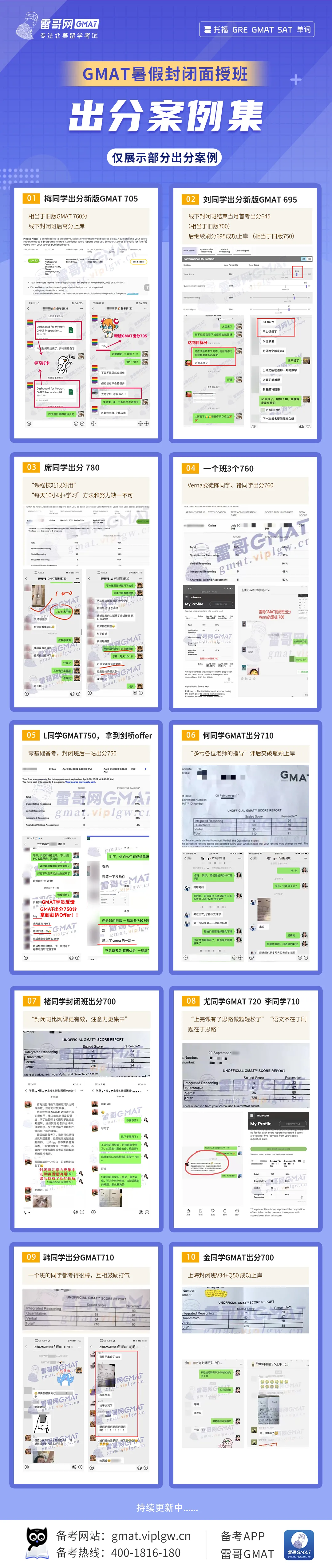 GMAT课程的本质是帮助大家顺利出分,所以课程出分情况相信是大家最为关心的,这里精选了部分有代表性的封闭班出分,以供参考。