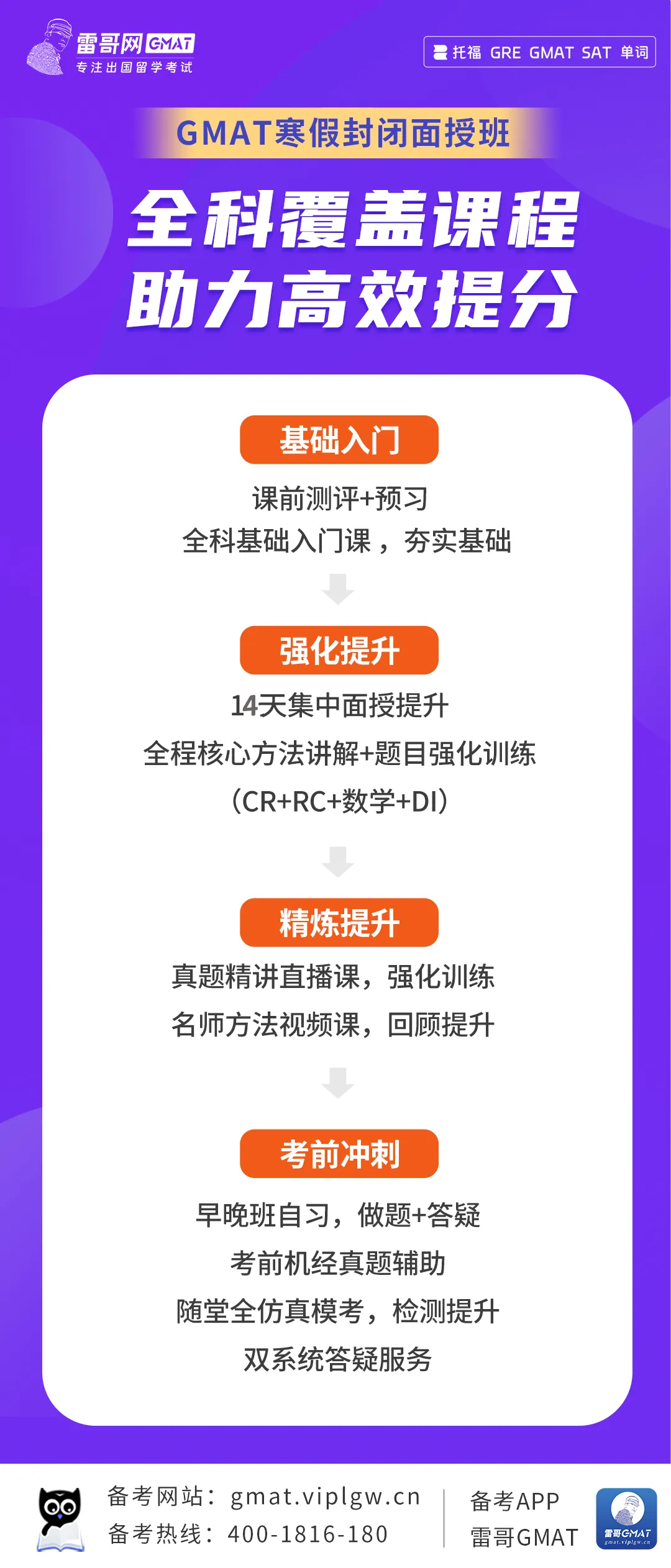 上海/成都/北京/深圳等多地同步开班,雷哥gmat封闭班正在火热预约中,高效出分就选雷哥!扫码添加立即咨询哦!
