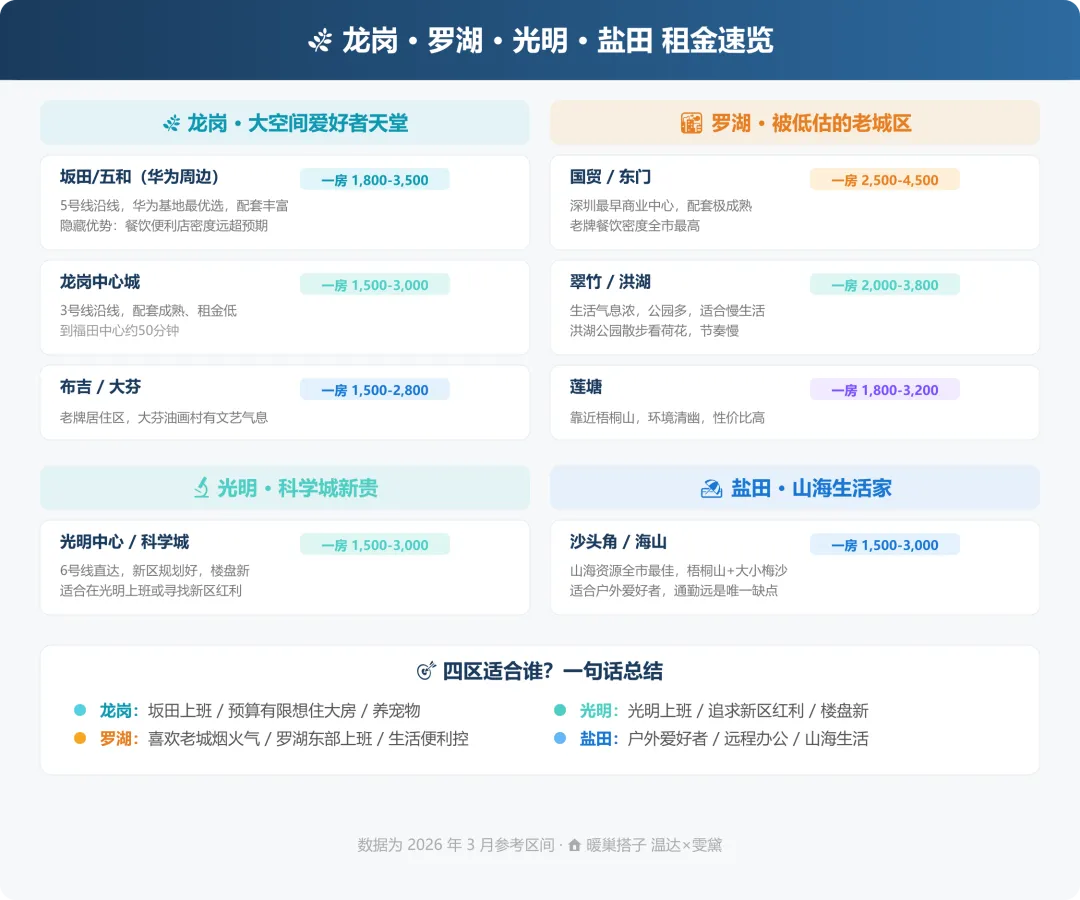 温达:租金参考:1,500-3,000 元(一房)。3 号线沿线,龙岗自己的配套中心,万达广场、龙城广场商圈都在附近。配套成熟、租金低,缺点是离南山福田确实远——地铁到福田中心约 50 分钟。如果你在龙岗或者罗湖东部上班,住这里性价比拉满。