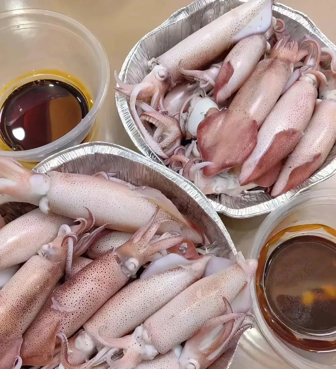 2. 鱿鱼(枪乌贼):成年鱿鱼体型更大,胴部呈锥形,内壳为薄而透明的角质,腕足有10条,触腕末端膨大,常被用来爆炒、烧烤,和吹筒仔是“同类不同 size”;