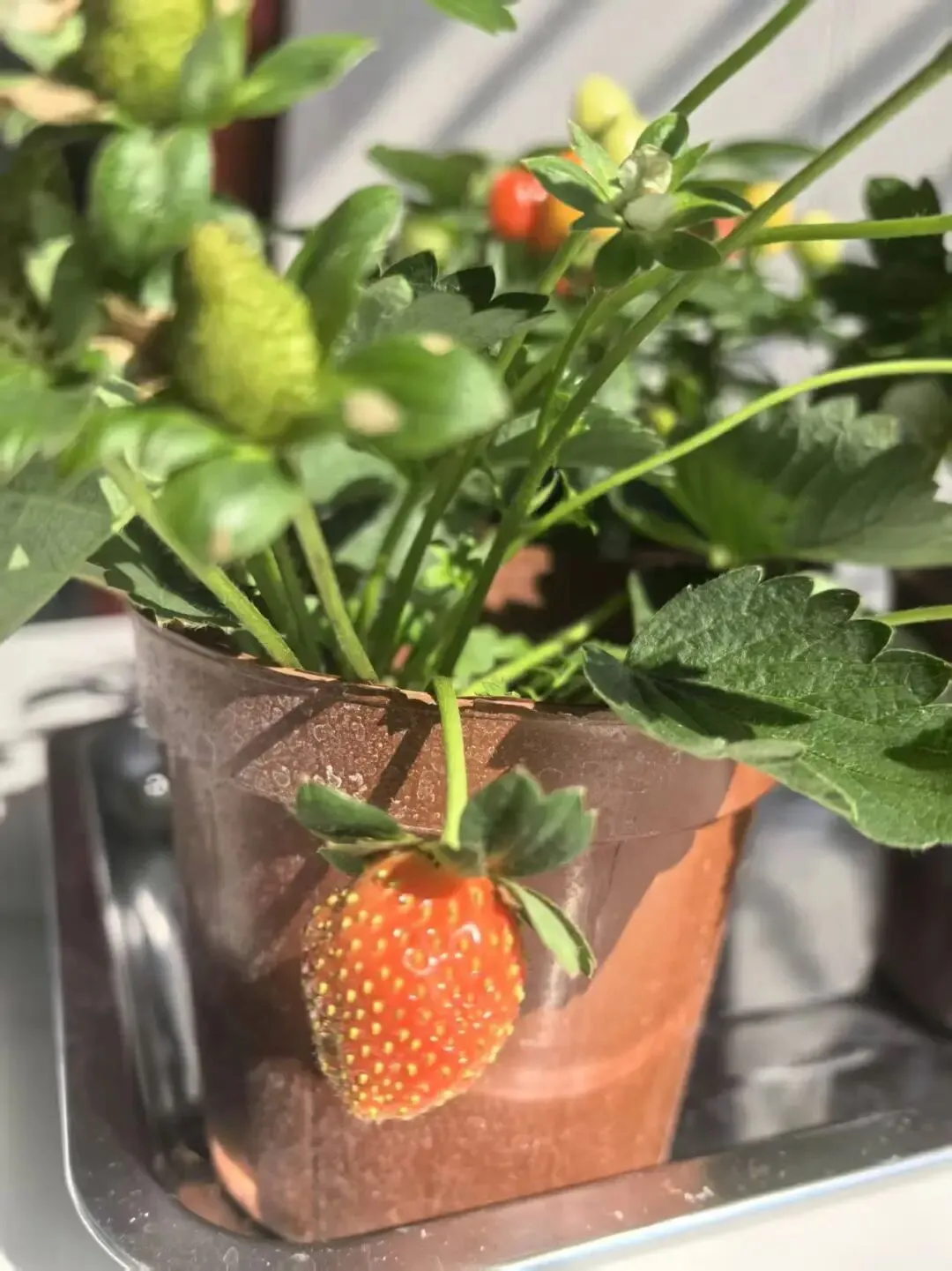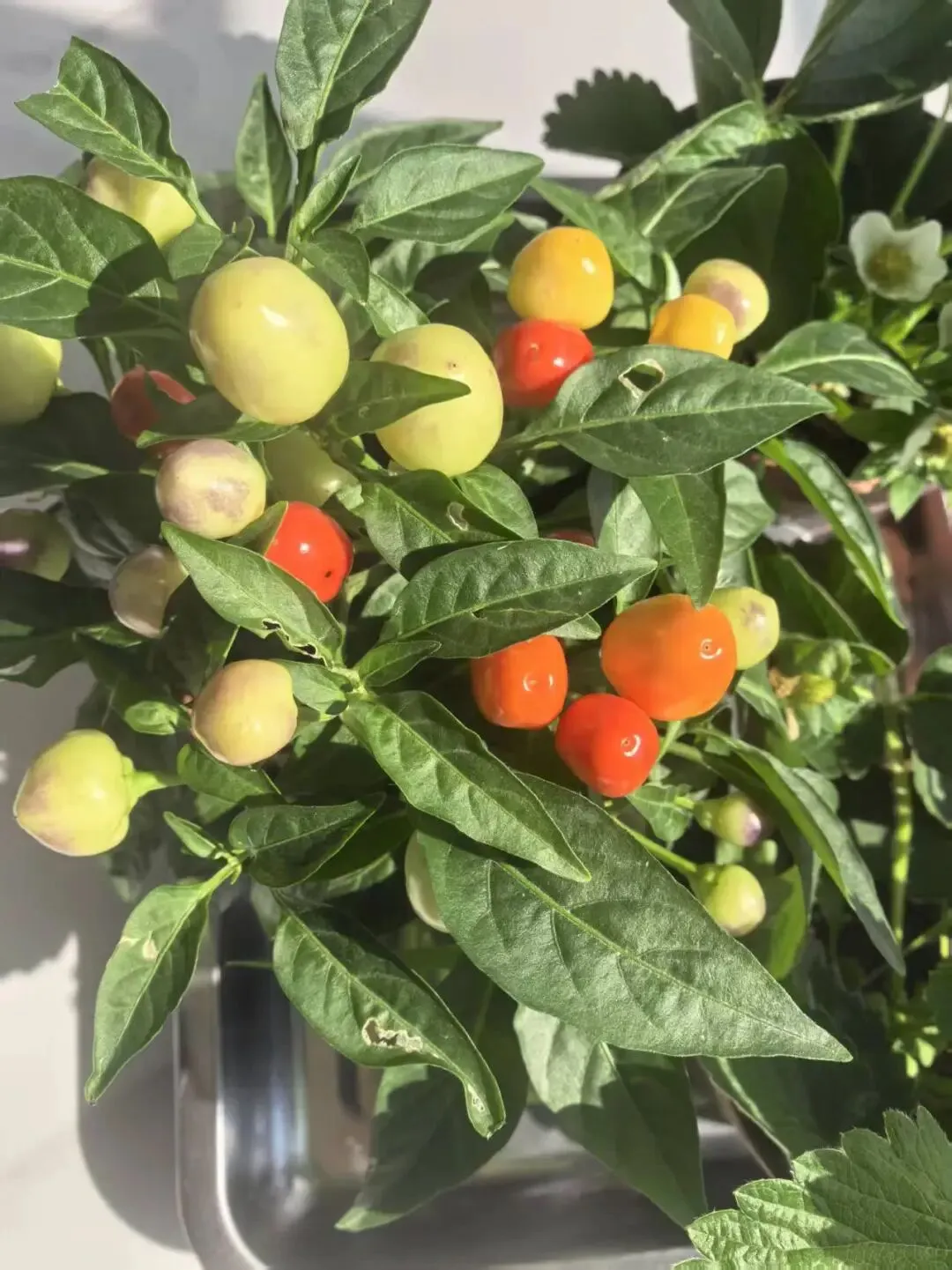 深圳气候是阳台种植“天选buff”,温暖湿润、光照充足,四季草莓全年挂果,五彩辣椒爆盆到深秋。哪怕朝九晚五带娃,也能轻松拿捏——草莓盆里白花、青果、红果挤成串,辣椒丛中青黄橙红层层叠叠,把晚霞揉碎在叶片间。