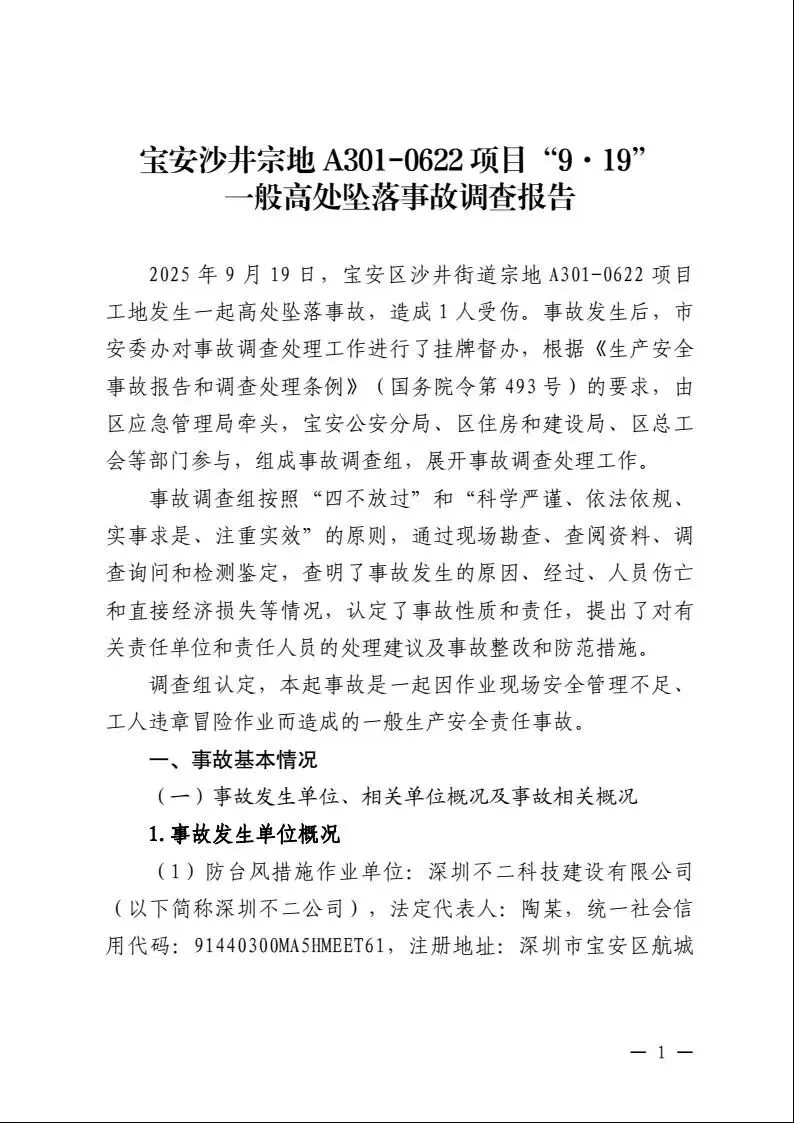 >深圳宝安沙井宗地A301-0622 项目“9·19”一般高处坠落事故调查报告!