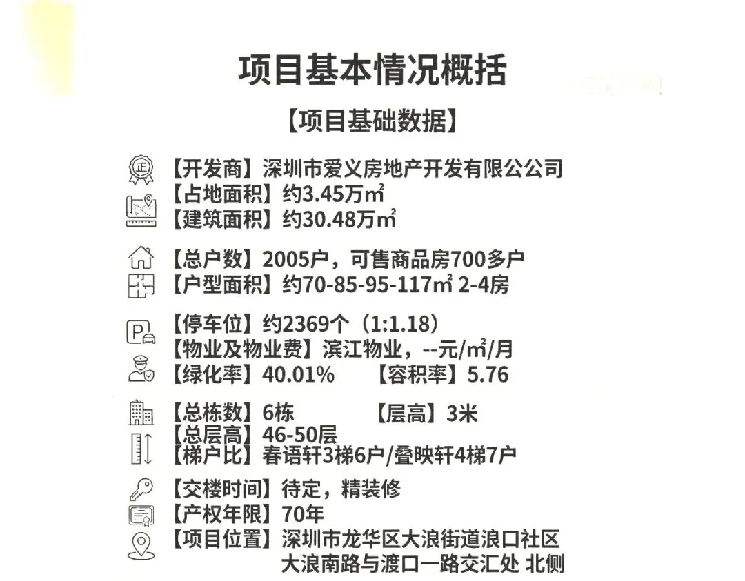 项目坐落龙华大浪街道大浪南路与浪口一路交汇处,紧邻大浪办事处、大浪体育公园,地处大浪时尚小镇+后浪新天地双商圈核心,3.45万㎡占地面积打造30.48万㎡综合社区,规划6栋46-50层高层,总户数2005户(可售商品房700余户),40.01%绿化率+5.76容积率,3米标准层高,搭配2369个停车位(1:1.18车位比),滨江自有物业加持,从社区规模到居住舒适度,全方位碾压同板块刚需盘。