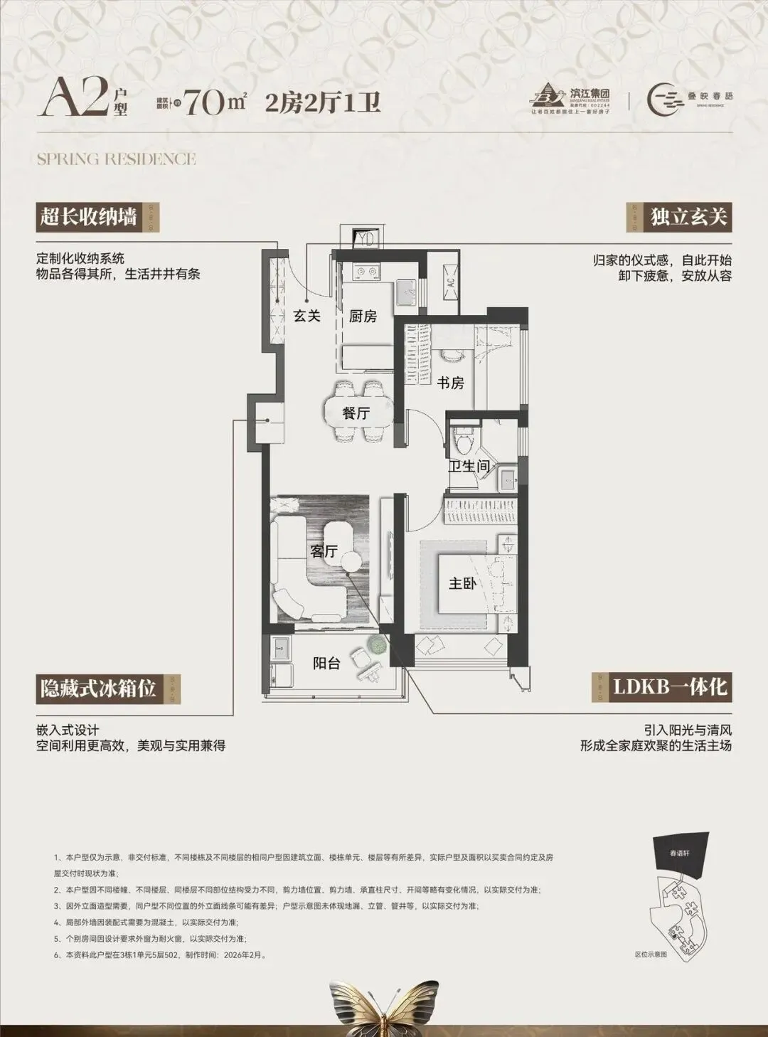 - 70㎡2房2厅2卫:刚需上车神户型,客厅开间3.1米不局促,独立玄关+超长收纳墙+隐藏式冰箱位,LDKB一体化设计引清风阳光入室,250万起的价格,单身青年、小夫妻轻松拿下;