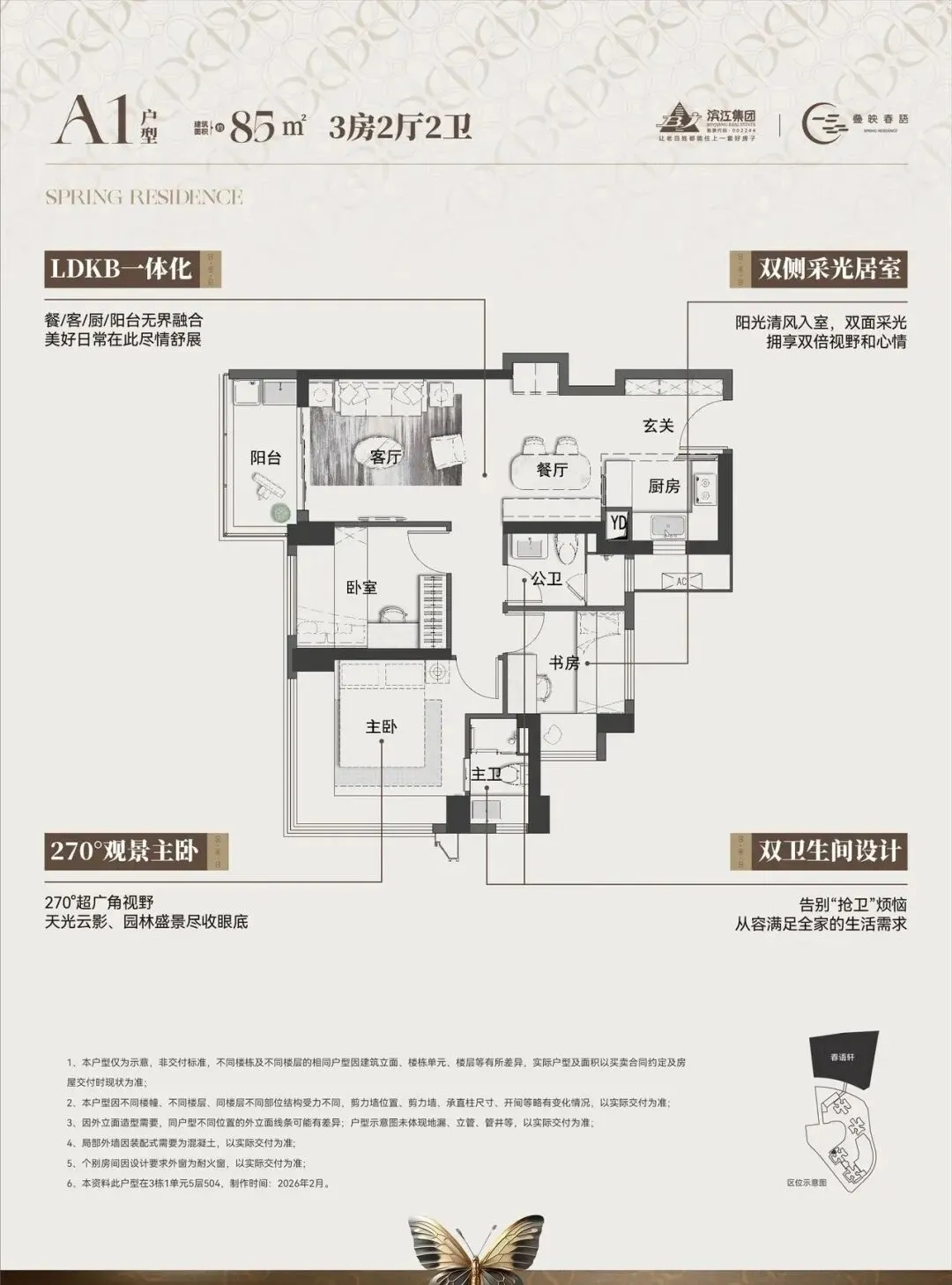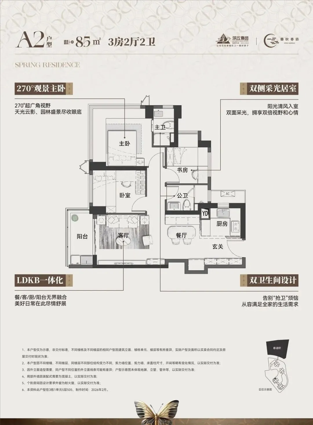 - 85㎡3房2厅2卫:首推主力户型,300-330万预算刚需家庭首选,85㎡做到三房两卫功能性拉满,客厅开间3.3米,主卧270°阳光飘窗+独立卫浴,三开间朝南+双侧采光次卧,老人孩子各有舒适空间,双卫生间设计告别晨起“抢卫”烦恼;