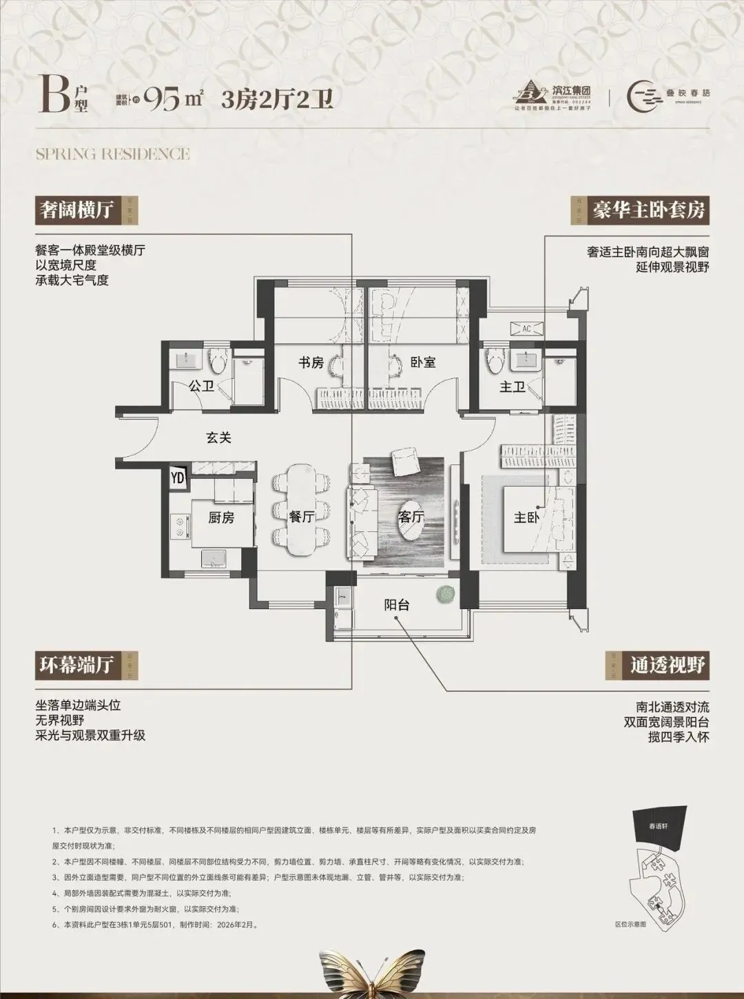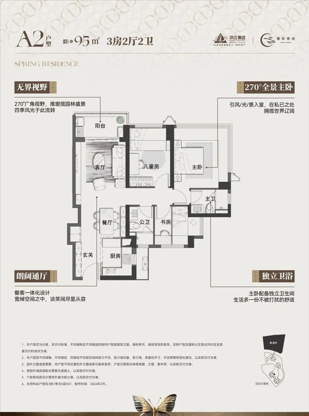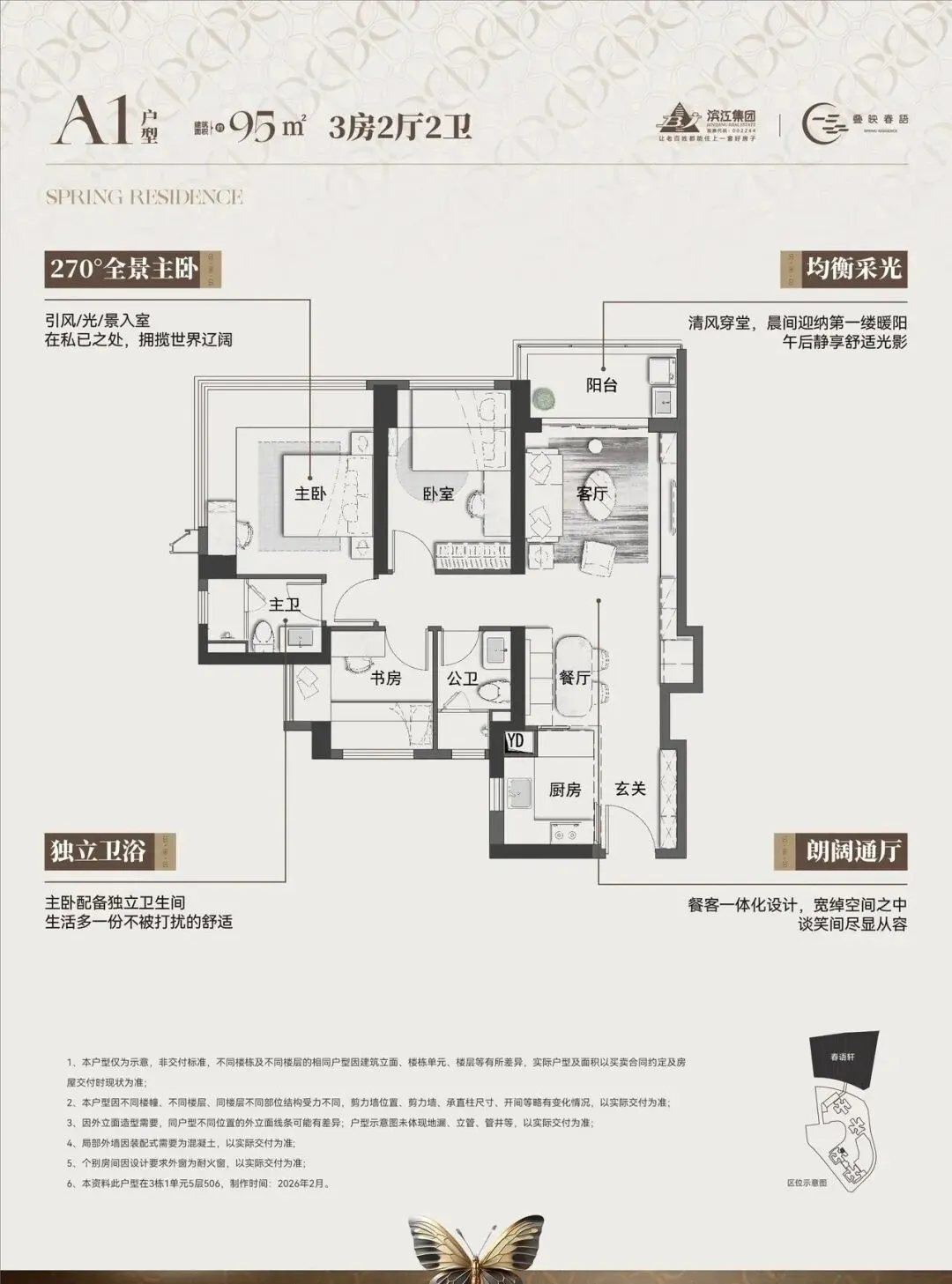 - 95㎡3房2厅2卫:空间升级之选,客厅开间3.5-3.6米,次卧面积增大,270°全景主卧+餐客一体化朗阔通厅,预算稍充裕的家庭,能拥有更从容的居住体验;