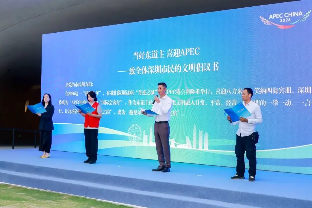 活动现场,福田“幸福会客厅”主理人蔡惠娟、腾讯志愿者协会会长王蓓、气象主播周禹、深圳“卷尺哥”四位市民代表登台,共同宣读《当好东道主 喜迎APEC——致全体深圳市民的文明倡议书》,号召邀请全体深圳人以点滴行动践行东道主责任,用真诚友善展现城市文明风采。