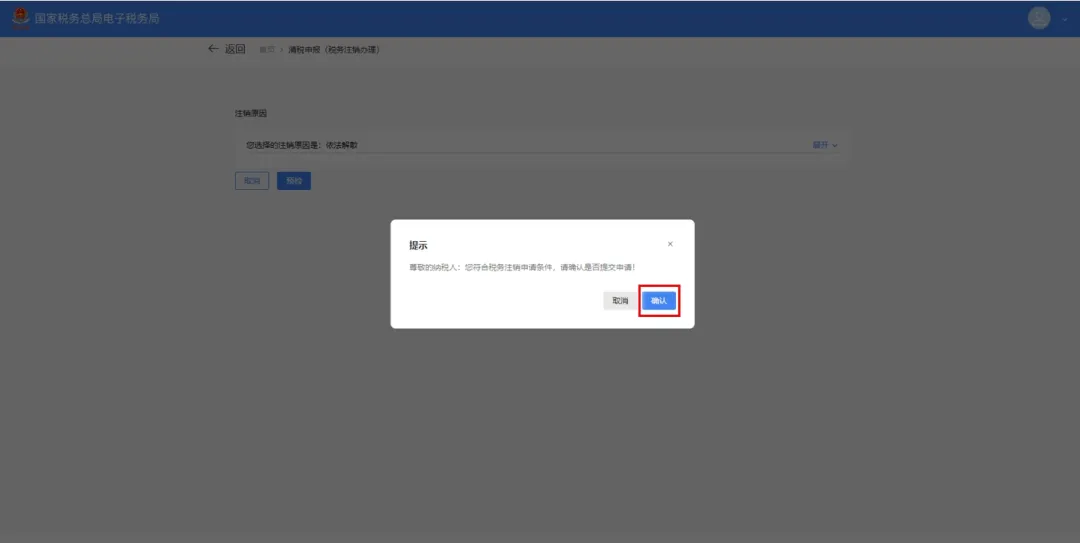 图 33 系统提示确认(3)跳转至提交成功界面,提示“尊敬的纳税人,您的清税申报申请已提