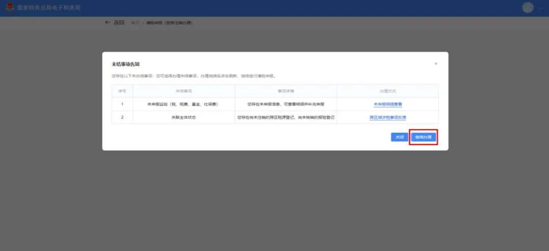 (1)弹出未结事项告知界面,系统提示“您存在以下未办结事项:您可选择办理未结事项,办理完结后点击刷新,继续进行清税申报。”,展示未结事项以及对应办理链接按钮,点击【继续办理】,如图 32 所示。