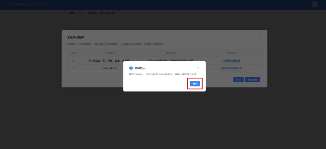 图 32 未结事项告知界面(2)系统提示“尊敬的纳税人:您符合税务注销申请条件,确认是否提交申请!”,点击【确定】,如图 33 所示。