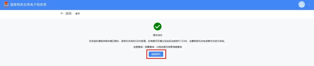 交,税务机关将在 5 日内受理,如有疑问可通过征纳互动或拨打 12366、主管税务机关电话等进行咨询。进度查询:我要查询-办税进度及结果信息查询”,点击【返回首页】返回电子税务局首页,如图 34 所示。
