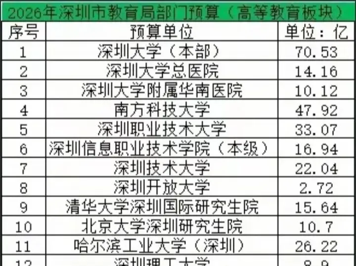 目前深圳拥有深圳大学、南方科技大学、深圳技术大学、深圳职业技术大学、深圳信息职业技术学院、深圳理工大学等外加一些985高校校区,总体而言,拥有的高校数量并不算少,但深圳对每所大学提供的预算都比较多,分别是深圳大学(本部)为70.53亿元,南方科技大学为47.92亿元、深圳职业技术大学为33.07亿元、哈尔滨工业大学深圳校区为26.22亿元、深圳技术大学为22.04亿元、深圳信息职业技术大学为16.94亿元、清华大学深圳国际研究生院为15.64亿元、北大深圳研究生院为10.7亿元、深圳理工大学为8.8亿元、深圳开放大学为2.72亿元。