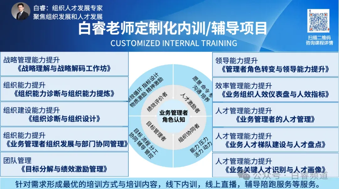国外大学MBA学位,拥有外资和内资企业管理工作经验和国际和国内咨询背景,对企业的全面经营管理、战略管理、管控模式、组织结构、绩效管理、薪酬激励、人才发展等方面有前瞻性理解和全面的咨询实践。对于如何根据企业的经营战略帮助企业进行组织转型和构建高绩效组织的领域,具有深入的洞察和成功的经验。曾多年游历海外,结交多位来自日本、澳大利亚等国的管理学大师,共同致力于管理史的研究,探求企业发展的过去和未来。 白睿老师授课风格热情、生动、幽默,深入浅出,能将西方先进的知识体系和管理理念与中国的实际情况有机结合,课程内容具有极强的实用性和实操性。