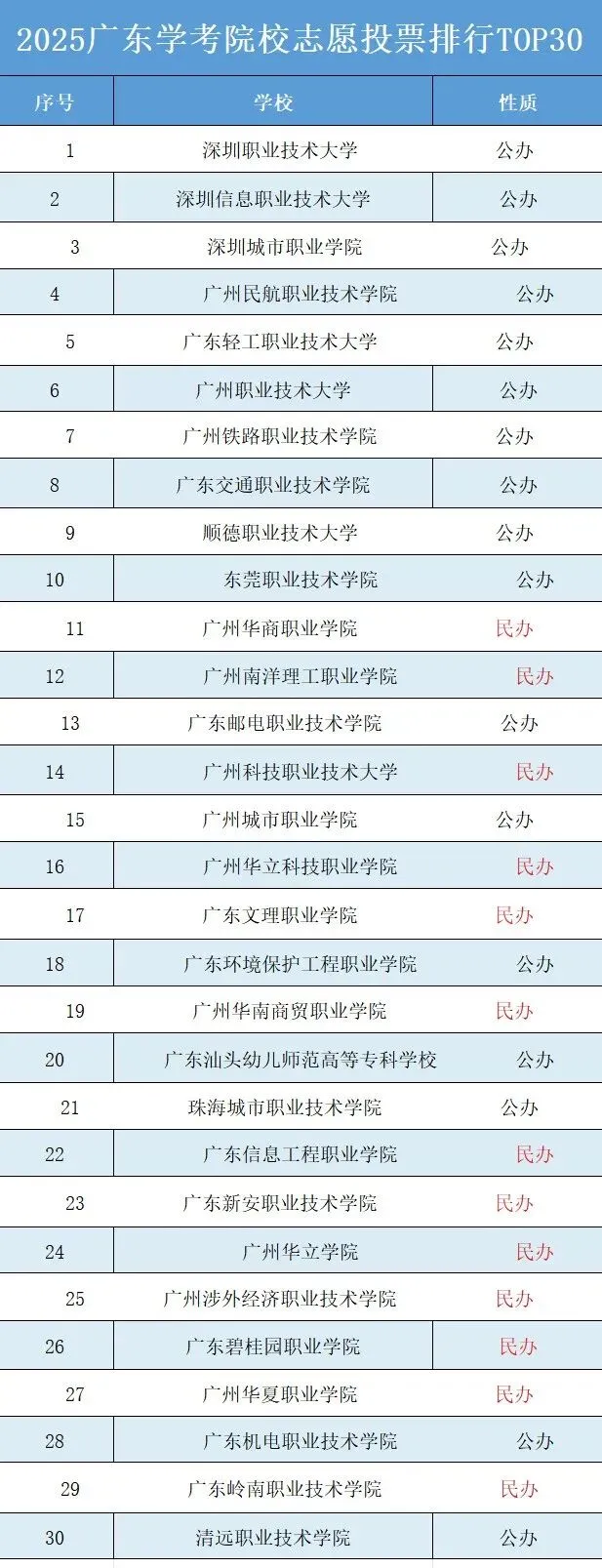 纵览学考与3+证书的报考排行榜前30名院校,主要位于广州、深圳、东莞等珠三角核心城市,其中不乏优质民办院校的身影。