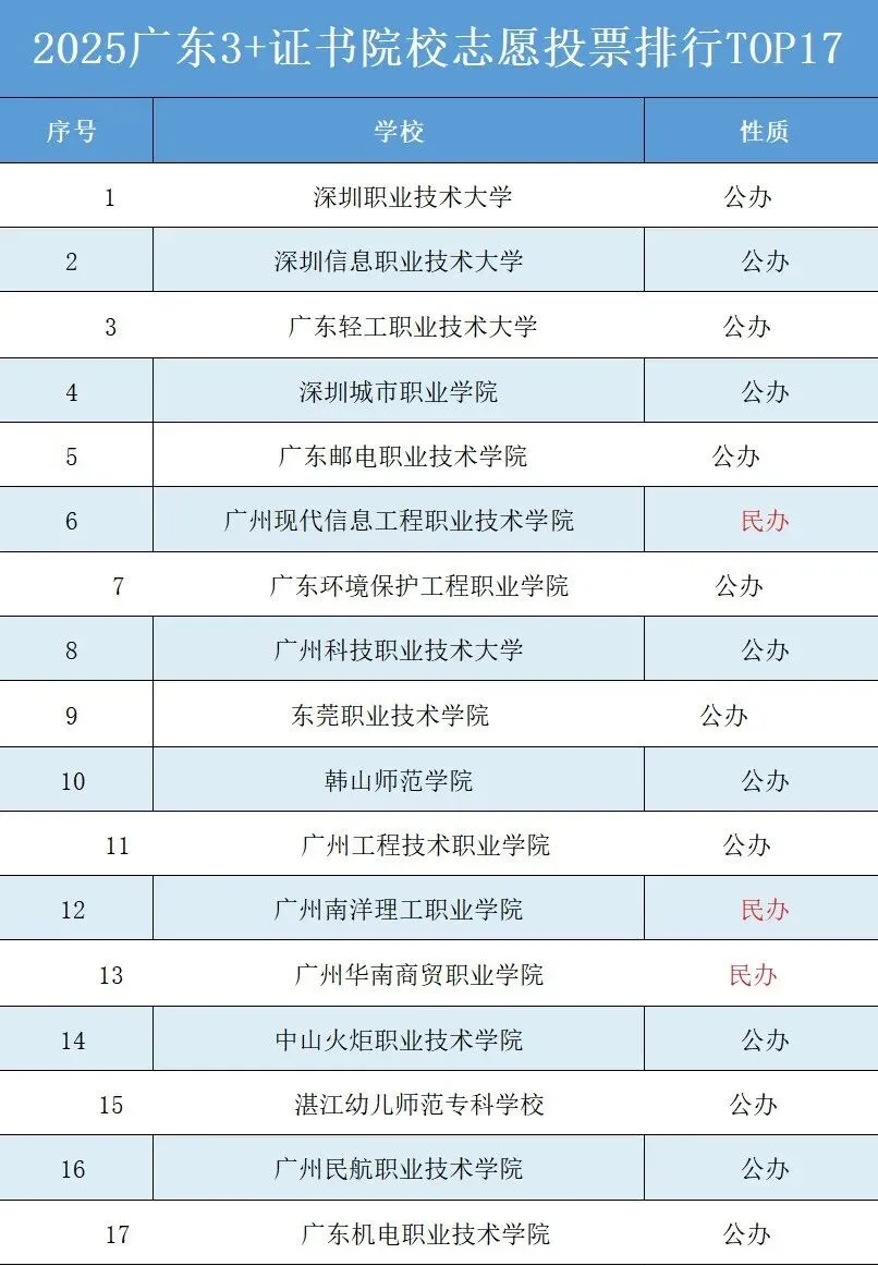 根据考生投票结果显示,学考填报热度前三所院校分别是:深圳职业技术大学、深圳信息职业技术大学、深圳城市职业学院;3+证书填报热度前三所院校分别是:深圳职业技术大学、深圳信息职业技术大学、广东轻工职业技术大学。(注:以下图表数据活动投票报考热度排名,非官方公布,仅供参考)👇